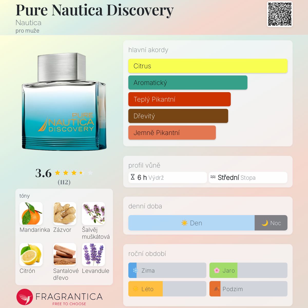Pure Nautica Discovery podle Nautica je Woody Spicy vůně pro muže. Pure Nautica Discovery byl/a uveden/a v roce 2011. Vrchní tóny jsou Mandarinka, Šalvěj muškátová a Citron amalfi; střední tóny jsouZázvor, Levandule a Koriandr ; základní tóny jsou Santalové dřevo a Virginský cedr.