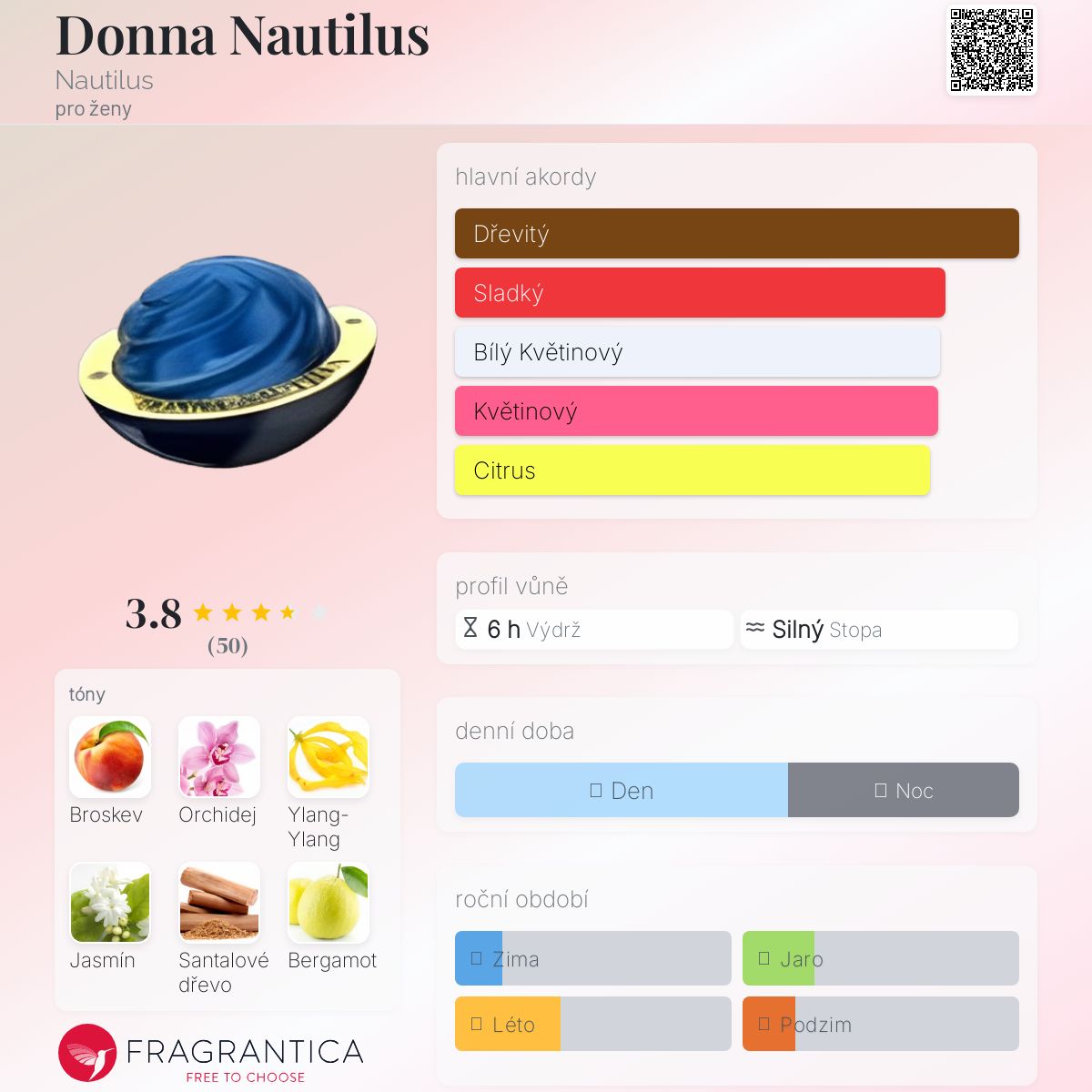 Donna Nautilus podle Nautilus je Orientální Floral vůně pro ženy. Donna Nautilus byl/a uveden/a v roce 2000. Vrchní tóny jsou Broskev, Bergamot a Mandarinka; střední tóny jsouOrchidej, Ylang-Ylang, Jasmín, Konvalinka a Růže ; základní tóny jsou Santalové dřevo, Cedr, Jantar (ambra) a Vetiver.