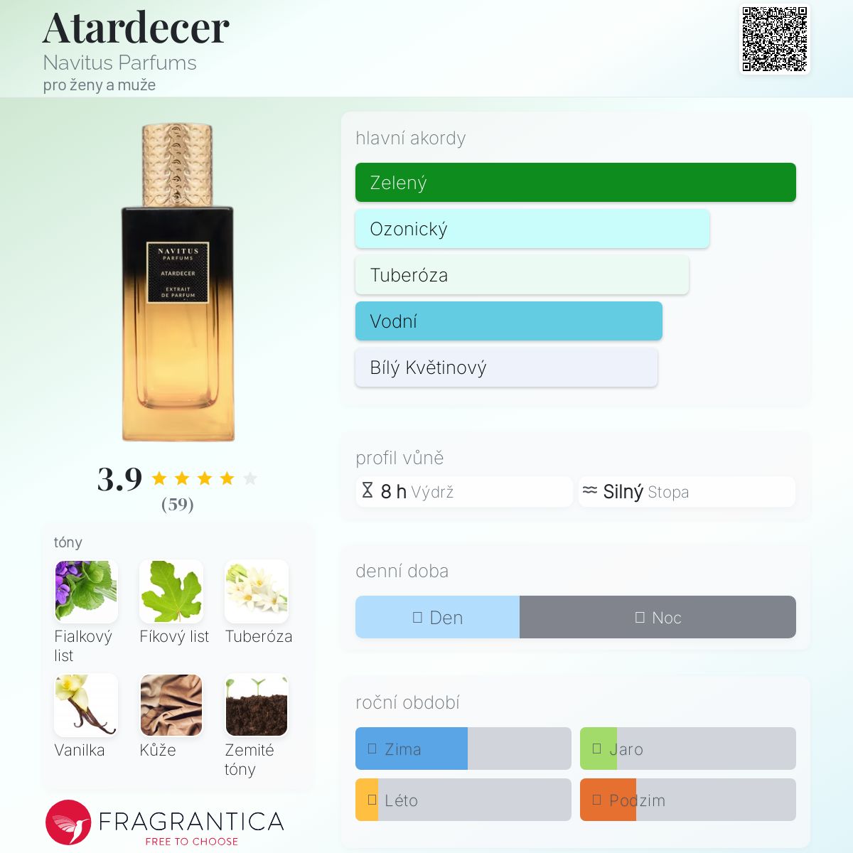 Atardecer podle Navitus Parfums je Leather vůně pro ženy a muže. Toto je nová vůně. Atardecer byl/a uveden/a v roce 2024. "Nosem" za touto vůní je Christian Carbonnel. Vrchní tóny jsou Fialkový list, Fíkový list a Tuberóza; střední tóny jsouKůže, Zemité tóny, Kouř, Cedr, Laoský oud, Agarové dřevo (oud) a Indický oud ; základní tóny jsou Vanilka, Dubový mech, Káva a Tabák.
