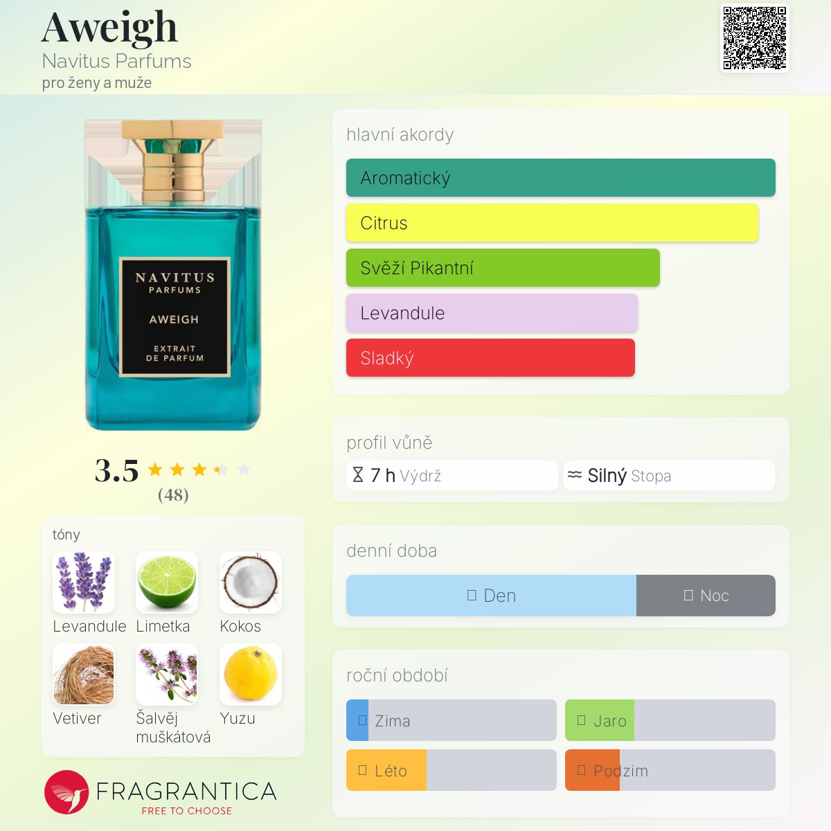 Aweigh podle Navitus Parfums je vůně pro ženy a muže. Aweigh byl/a uveden/a v roce 2021. "Nosem" za touto vůní je Jorge Lee. Vrchní tóny jsou Limetka, Kokos, Yuzu, Růžový pepř, Grapefruit a Kalábrijský bergamot; střední tóny jsouLevandule, Šalvěj muškátová, Zázvor, Pelargónie, Santalové dřevo a Muškátový oříšek ; základní tóny jsou Java vetiverový olej, Fazole tonka, Pižmo a Kadidlo.