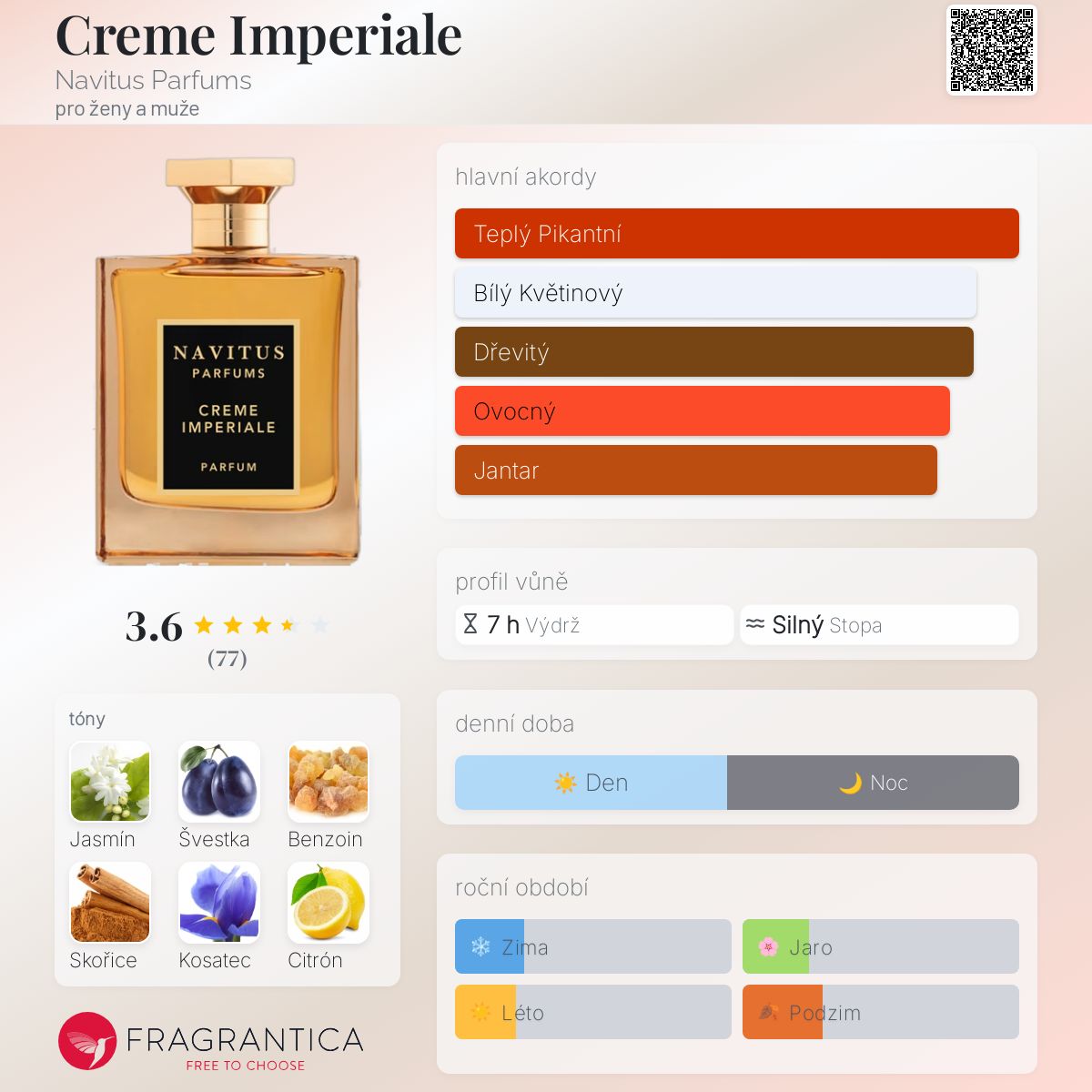 Creme Imperiale podle Navitus Parfums je vůně pro ženy a muže. Creme Imperiale byl/a uveden/a v roce 2021. "Nosem" za touto vůní je Julien Rasquinet. Vrchní tóny jsou Jasmín Sambac a Sicilský citron; střední tóny jsouŠvestka, Cejlonská skořice, Kosatec, Pelargónie a Turecká růže ; základní tóny jsou Jasmín, Benzoin, Guajakové dřevo a Virginský cedr.