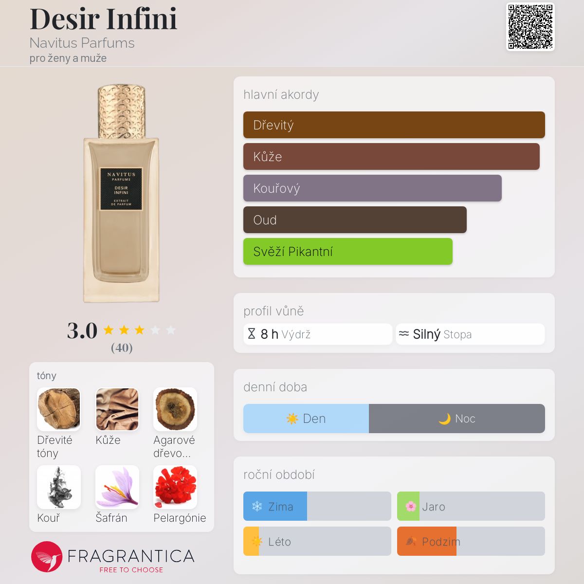 Desir Infini podle Navitus Parfums je vůně pro ženy a muže. Desir Infini byl/a uveden/a v roce 2023. "Nosem" za touto vůní je Bertrand Duchaufour. Vrchní tóny jsou Červené ovoce a Italský citrón; střední tóny jsouŠafrán a Pelargónie ; základní tóny jsou Dřevité tóny, Kůže, Agarové dřevo (oud), Kouř a Jantar (ambra).
