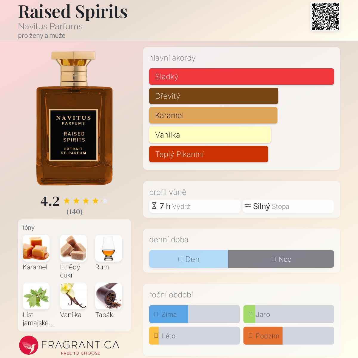 Raised Spirits podle Navitus Parfums je Aromatic Spicy vůně pro ženy a muže. Raised Spirits byl/a uveden/a v roce 2022. Raised Spirits byl/a vytvořen/a Dominique Ropion a Julien Rasquinet. Vrchní tóny jsou Karamel, Rum a List jamajského pepře; střední tóny jsouKaramel, Hnědý cukr a Cukrová třtina ; základní tóny jsou Bourbonská vanilka, Tabák, Dub a Kašmírové dřevo.