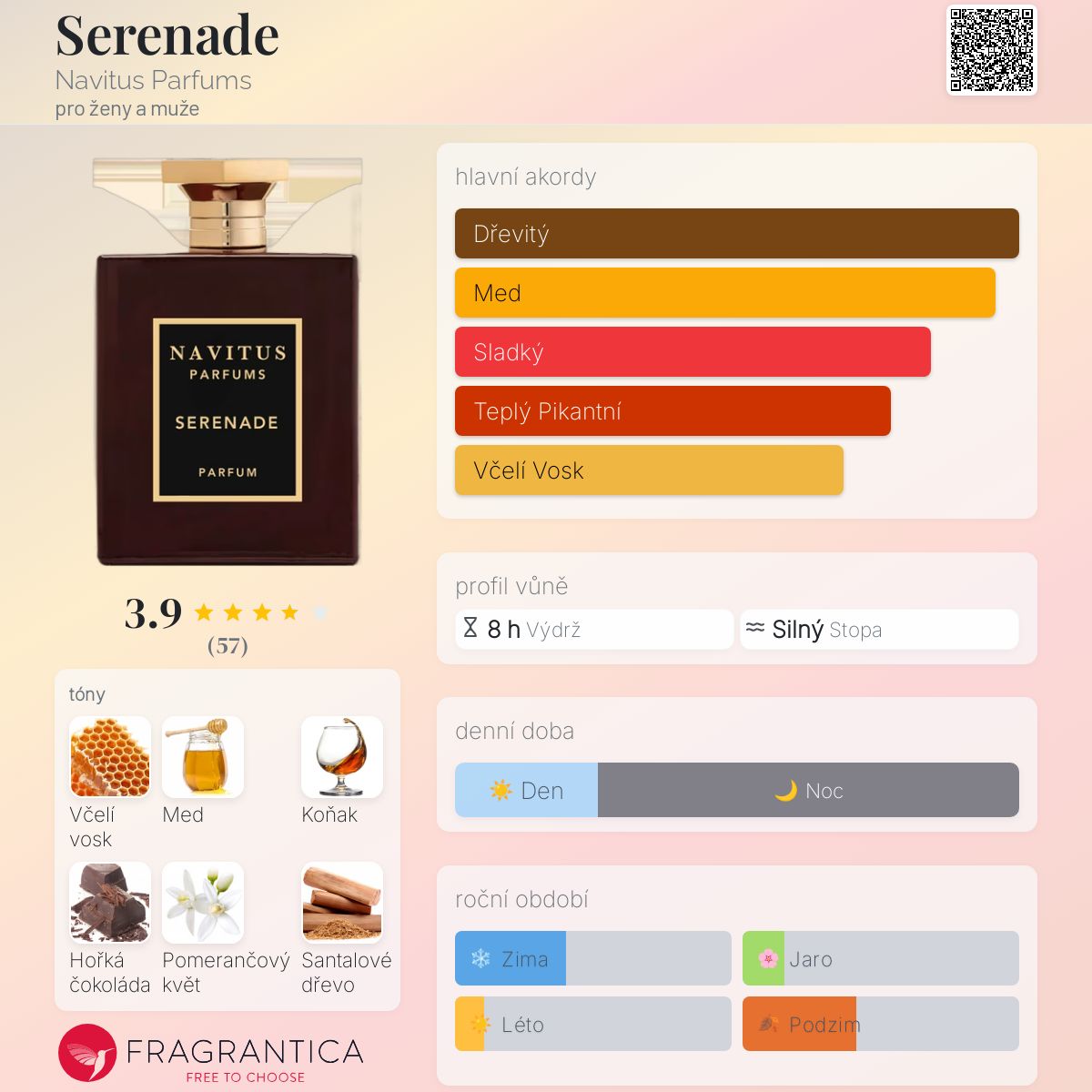 Serenade podle Navitus Parfums je vůně pro ženy a muže. Serenade byl/a uveden/a v roce 2021. "Nosem" za touto vůní je Jorge Lee. Vrchní tóny jsou Koňak, Hořká čokoláda a Pomerančový květ; střední tóny jsouVčelí vosk, Med a Santalové dřevo ; základní tóny jsou Java vetiverový olej, Fazole tonka, List indonéského pačuli, Virginský cedr a Pižmo.