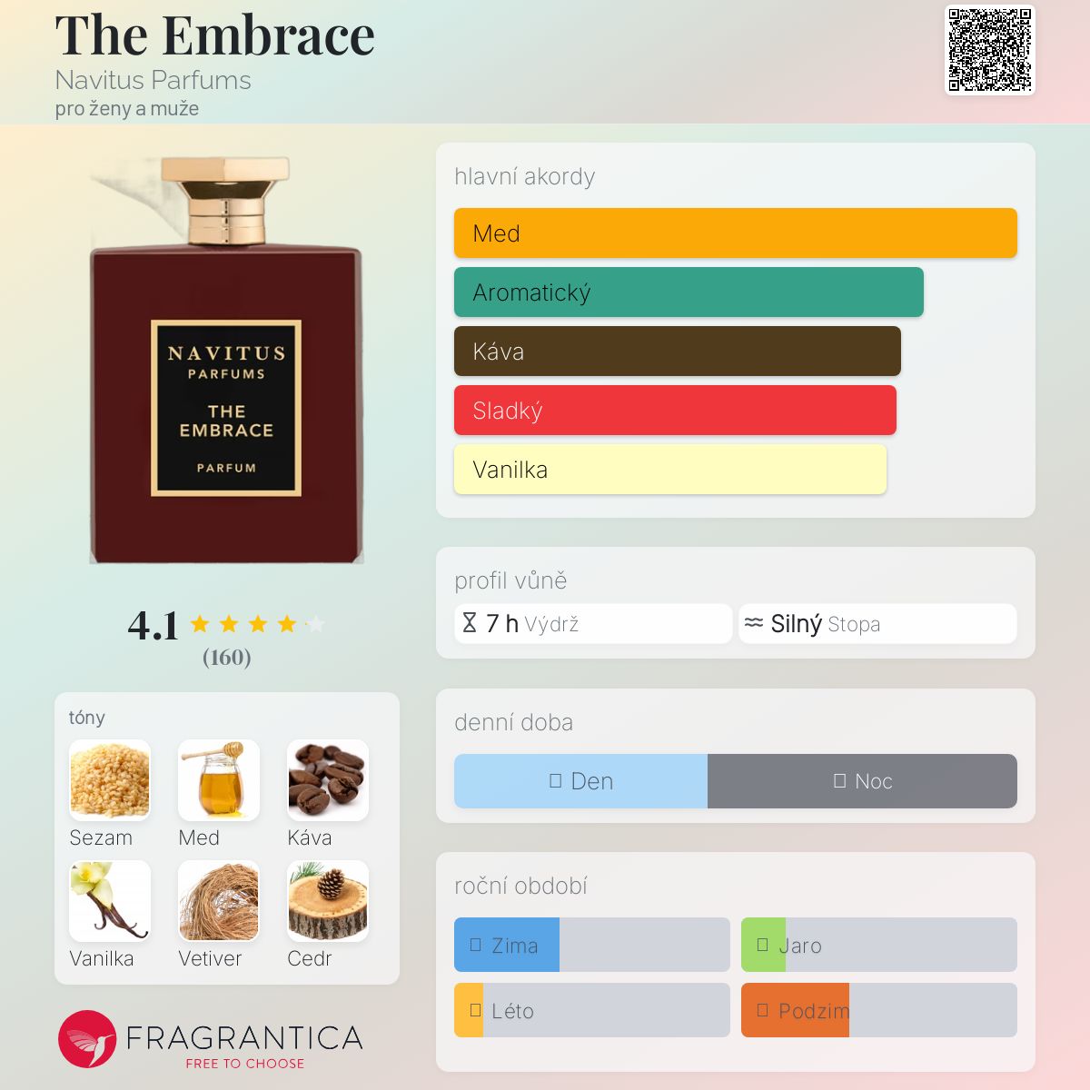 The Embrace podle Navitus Parfums je vůně pro ženy a muže. The Embrace byl/a uveden/a v roce 2020. "Nosem" za touto vůní je Sidonie Lancesseur. Vrchní tóny jsou Sezam, Italská mandarinka a Bergamot; střední tóny jsouMed a Káva ; základní tóny jsou Madagaskarská vanilka, Haitský vetiver a Virginský cedr.