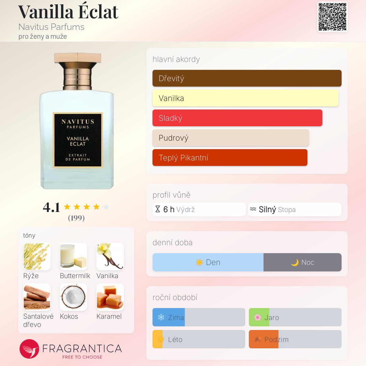 Vanilla Éclat podle Navitus Parfums je Orientální Vanilla vůně pro ženy a muže. Toto je nová vůně. Vanilla Éclat byl/a uveden/a v roce 2024. "Nosem" za touto vůní je Christian Provenzano. Vrchní tóny jsou Rýže, Kokos a Sicilský bergamot; střední tóny jsouPodmáslí, Karamel, Koření a Skořice ; základní tóny jsou Vanilka, Santalové dřevo, Guajakové dřevo a Jantar (ambra).