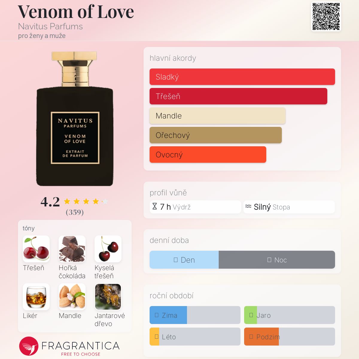 Venom of Love podle Navitus Parfums je Floral Fruity Gourmand vůně pro ženy a muže. Venom of Love byl/a uveden/a v roce 2022. "Nosem" za touto vůní je Sidonie Lancesseur. Vrchní tóny jsou Kyselá třešeň, Likér a Hořká mandle; střední tóny jsouTřešeň, Čokoláda, Turecká růže a Egyptský jasmín ; základní tóny jsou Mandle, Jantarové dřevo, Vanilka a Šlehačka.