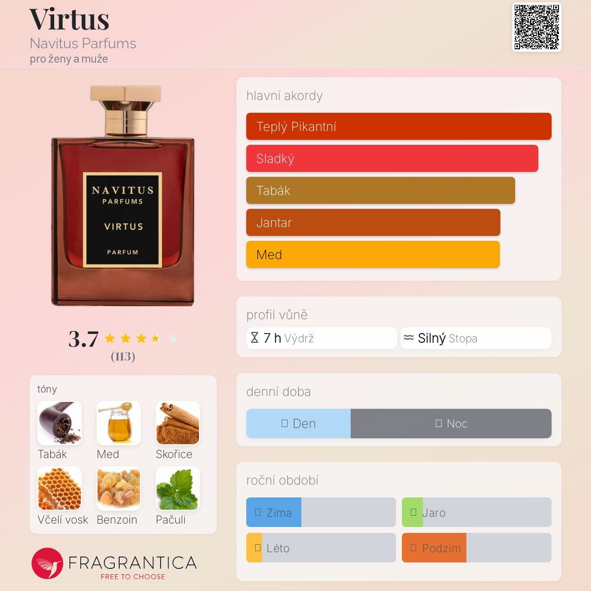 Virtus podle Navitus Parfums je vůně pro ženy a muže. Virtus byl/a uveden/a v roce 2019. "Nosem" za touto vůní je Bertrand Duchaufour. Vrchní tóny jsou Muškátový oříšek, Davana, Kardamom, Šafrán a Bergamot; střední tóny jsouMed, Skořice, Včelí vosk, Fíkový nektar, Šalvěj muškátová a Mango ; základní tóny jsou Tabák, Benzoin, Pačuli, Vanilka, Labdanum, Naplavené dříví, Ambra a Pižmo.