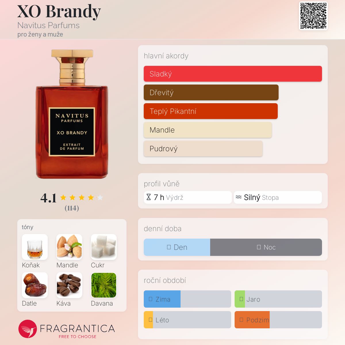 XO Brandy podle Navitus Parfums je Floral vůně pro ženy a muže. XO Brandy byl/a uveden/a v roce 2021. "Nosem" za touto vůní je Sidonie Lancesseur. Vrchní tóny jsou Mandle, Datle a Davana; střední tóny jsouBrandy, Káva, Otočník a Virginský cedr ; základní tóny jsou Cukrová třtina, Balzám Tolu, List indonéského pačuli a Santalové dřevo.