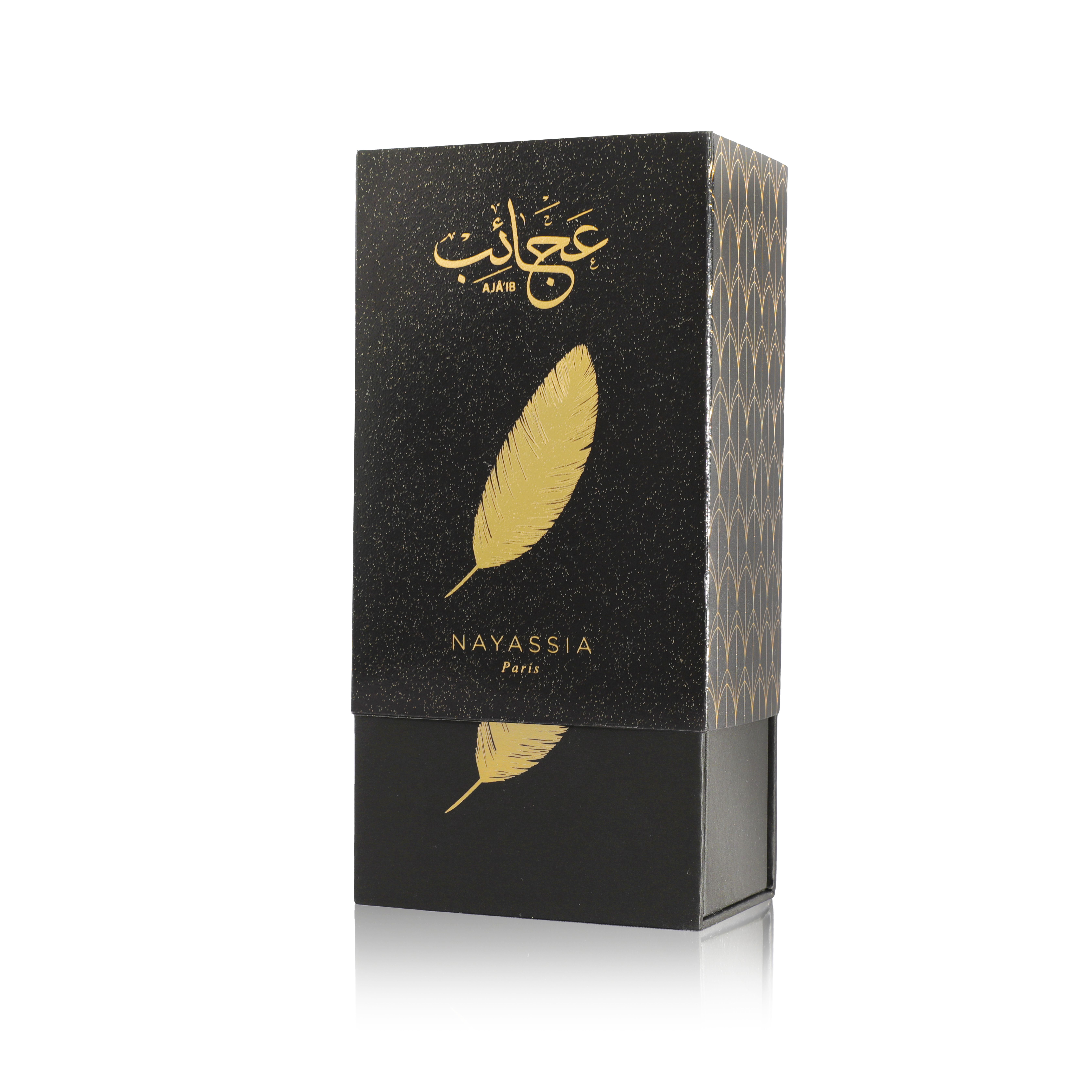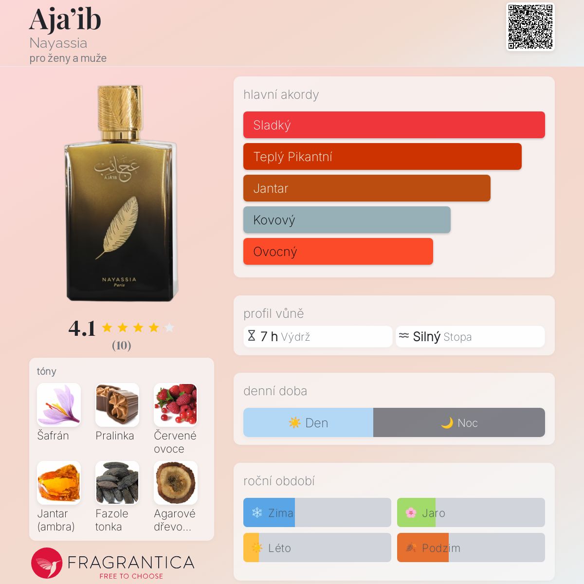 Aja’ib podle Nayassia je vůně pro ženy a muže. Aja’ib byl/a uveden/a v roce 2020. Vrchní tóny jsou Šafrán, Červené ovoce a Bergamot; střední tóny jsouPralinka a Jasmín ; základní tóny jsou Jantar (ambra), Fazole tonka a Agarové dřevo (oud).
