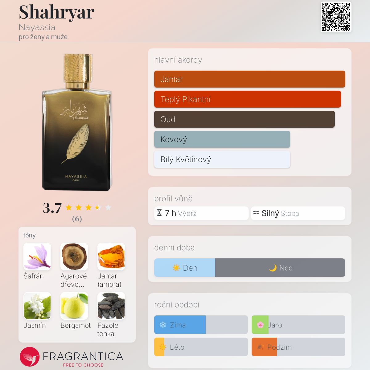 Shahryar podle Nayassia je vůně pro ženy a muže. Shahryar byl/a uveden/a v roce 2022. Vrchní tóny jsou Šafrán, Bergamot a Červené ovoce; střední tóny jsouJasmín a Pralinka ; základní tóny jsou Agarové dřevo (oud), Jantar (ambra) a Fazole tonka.