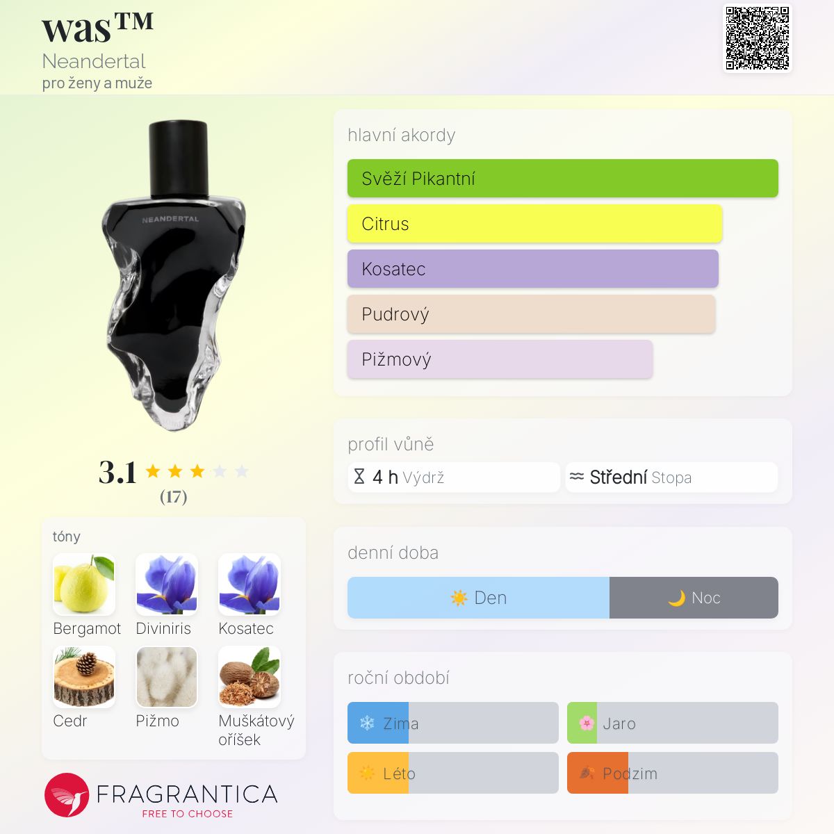 was™ podle Neandertal je Orientální Woody vůně pro ženy a muže. Toto je nová vůně. was™ byl/a uveden/a v roce 2025. Vrchní tóny jsou Bergamot, Muškátový oříšek, Maté a Kardamom; střední tóny jsouBožský kosatec, Pelargónie, Hřebíček a Skalní růže ; základní tóny jsou Cedr, Pižmo, Pačuli, Jantar (ambra), Santalové dřevo, Vanilka, Vetiver a Styrax.