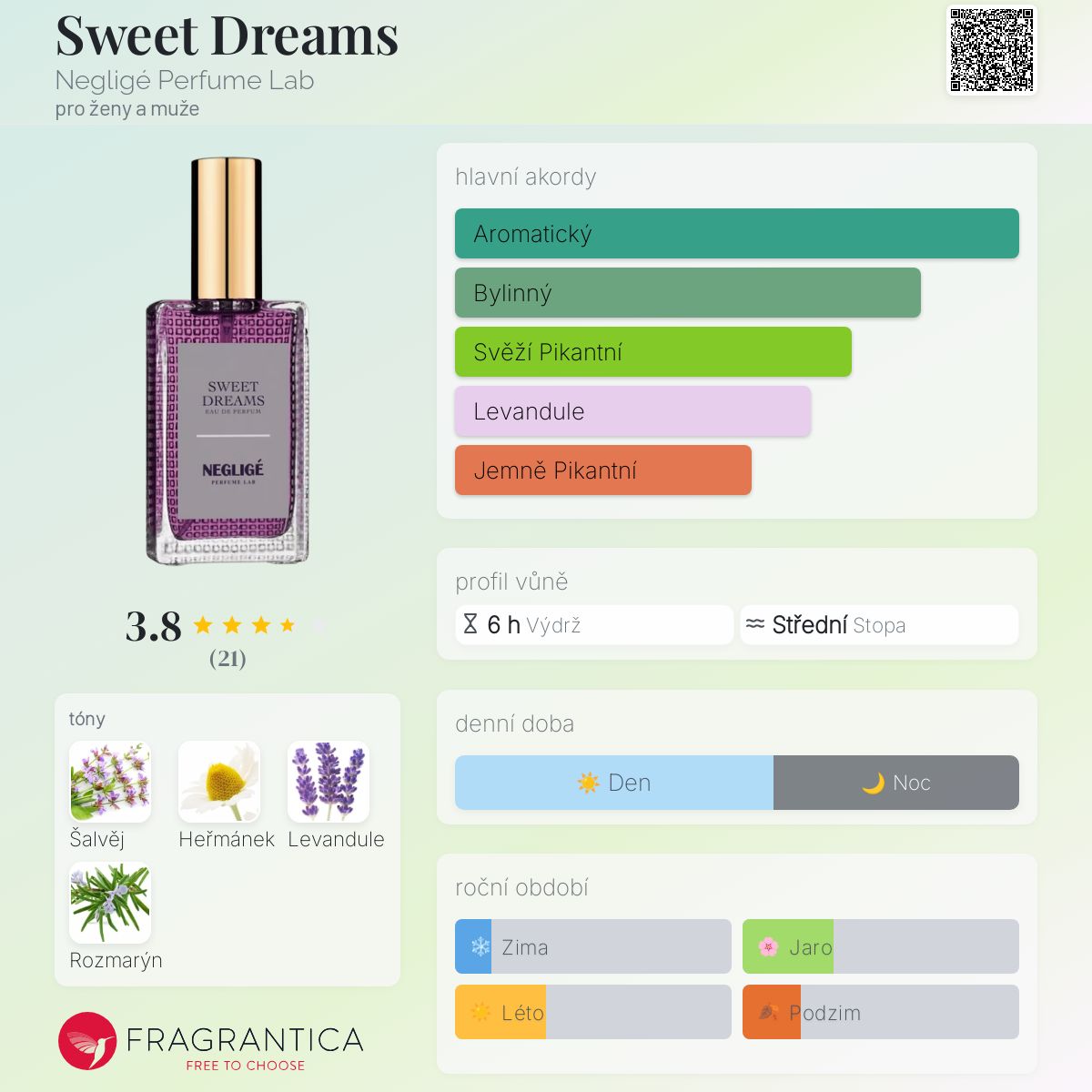 Sweet Dreams podle Negligé Perfume Lab je Floral Green vůně pro ženy a muže. Sweet Dreams byl/a uveden/a v roce 2020. "Nosem" za touto vůní je Maria Chaikovskaya. střední tóny jsouLevandule, Divoká levandule a Rozmarýn ; základní tóny jsou Šalvěj a Heřmánek.