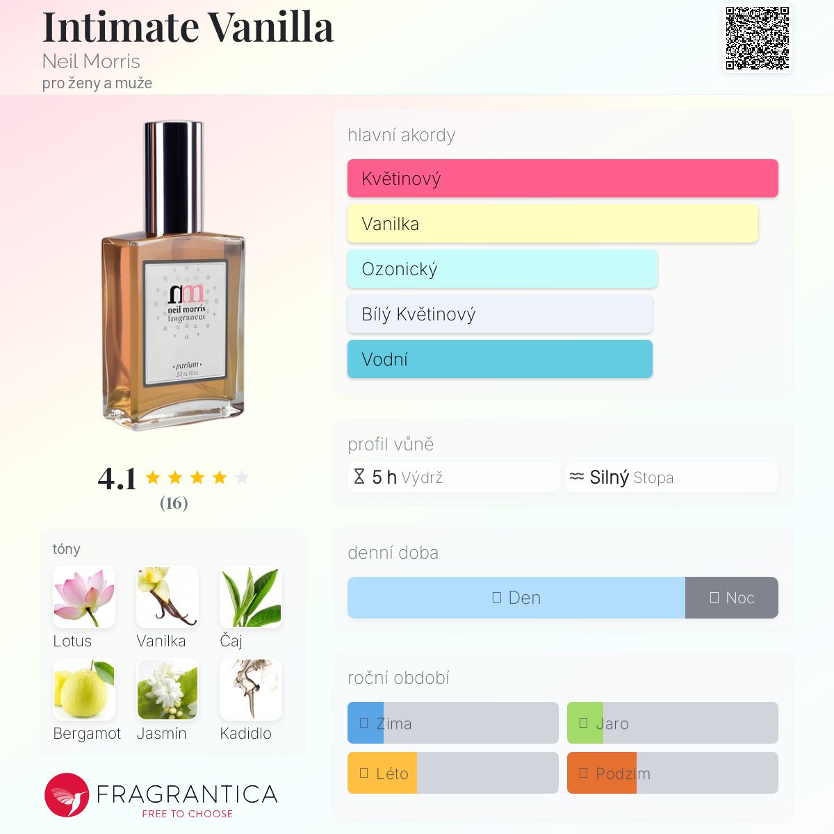 Intimate Vanilla podle Neil Morris je Orientální Vanilla vůně pro ženy a muže. Intimate Vanilla byl/a uveden/a v roce 2000. "Nosem" za touto vůní je Neil Morris. Vrchní tóny jsou Lotus a Bergamot; střední tóny jsouZelený čaj a Jasmín ; základní tóny jsou Vanilka, Madagaskarská vanilka, Kadidlo, Pižmo a Jantar (ambra).