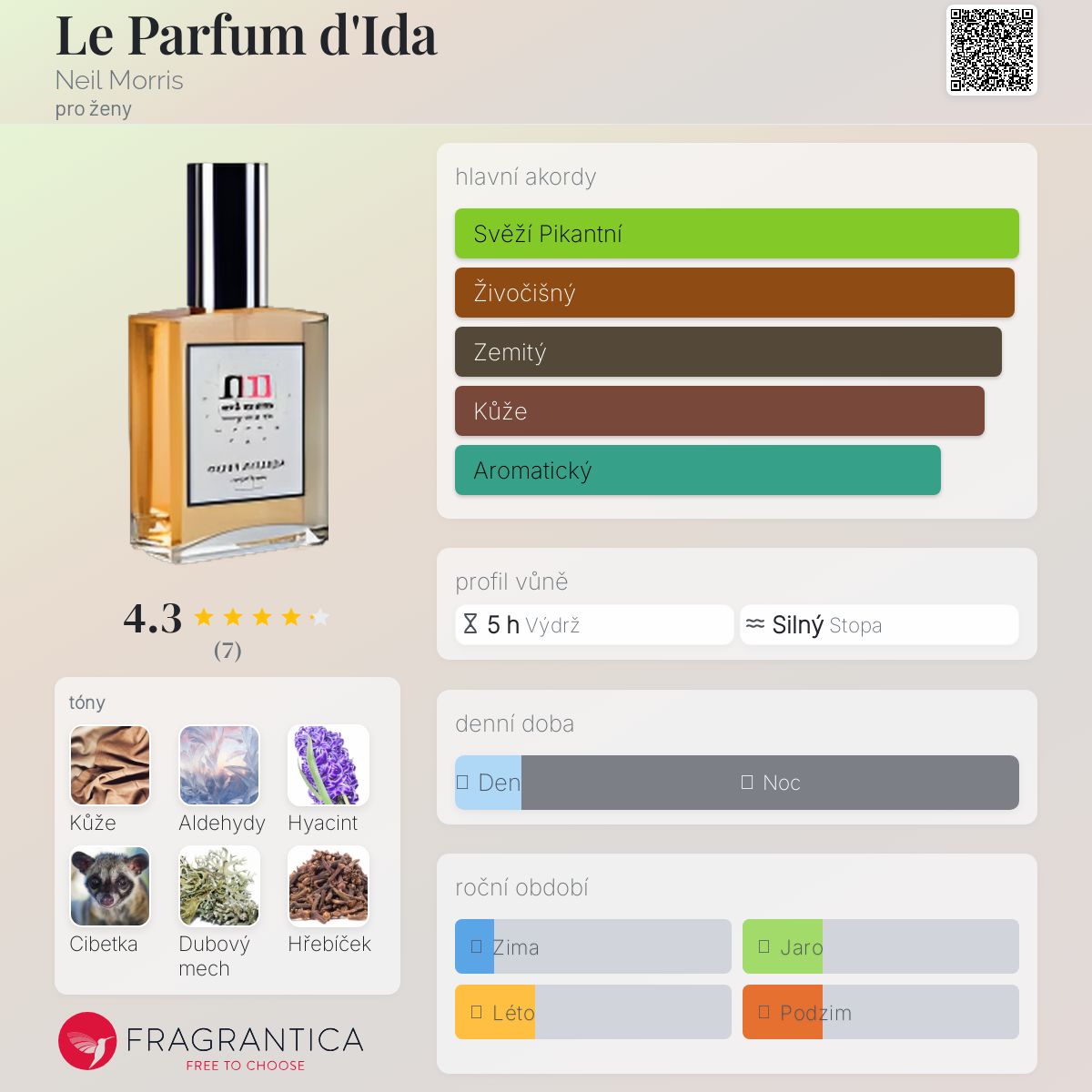 Le Parfum d'Ida podle Neil Morris je Chypre Floral vůně pro ženy. "Nosem" za touto vůní je Neil Morris. Vrchní tóny jsou Aldehydy, Hřebíček, Elimi a Ostružina; střední tóny jsouHyacint, Pelargónie, Narcis, Ylang-Ylang a Gardénie ; základní tóny jsou Ruská kůže, Cibetka, Dubový mech, Agarové dřevo (oud), Vetiver, Orris, Nard himálajský a Myrha.
