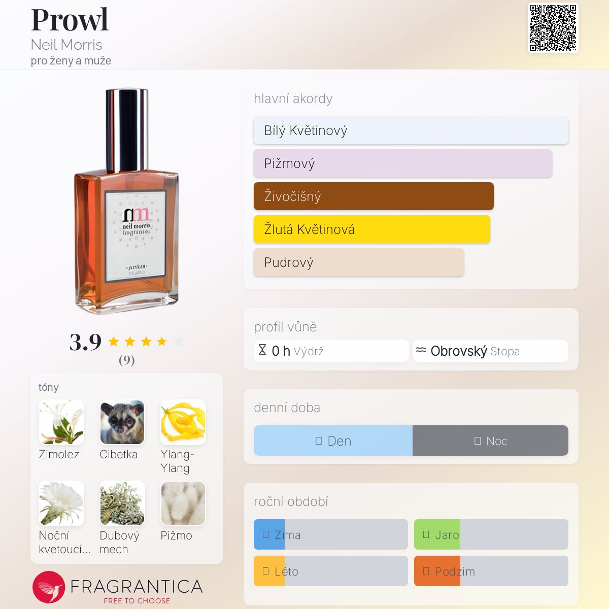 Prowl podle Neil Morris je Orientální Woody vůně pro ženy a muže. Prowl byl/a uveden/a v roce 2009. "Nosem" za touto vůní je Neil Morris. Vrchní tóny jsou Černý pepř a Zelený čaj; střední tóny jsouZimolez, Ylang-Ylang, Noční kvetoucí cereus (kaktus), Jasmín Sambac a Tuberóza ; základní tóny jsou Cibetka, Dubový mech, Pižmo, Pačuli, Jantar (ambra) a Vanilka.