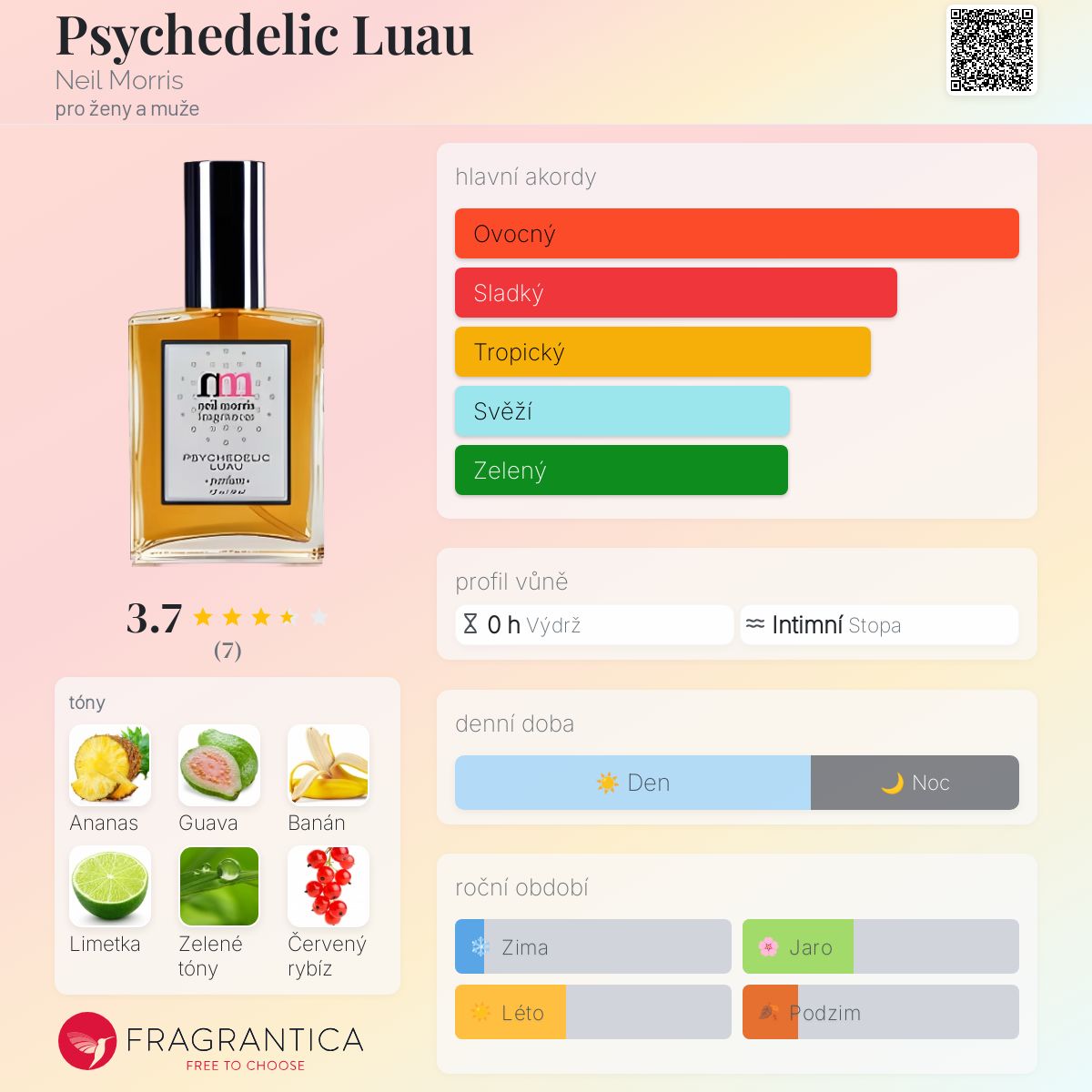 Psychedelic Luau podle Neil Morris je Floral Fruity vůně pro ženy a muže. Psychedelic Luau byl/a uveden/a v roce 2019. Vrchní tóny jsou Banán, Limetka, Zelené listí a Červený rybíz; střední tóny jsouAnanas, Guava, Tuberóza a Karafiát ; základní tóny jsou Pižmo a Pačuli.