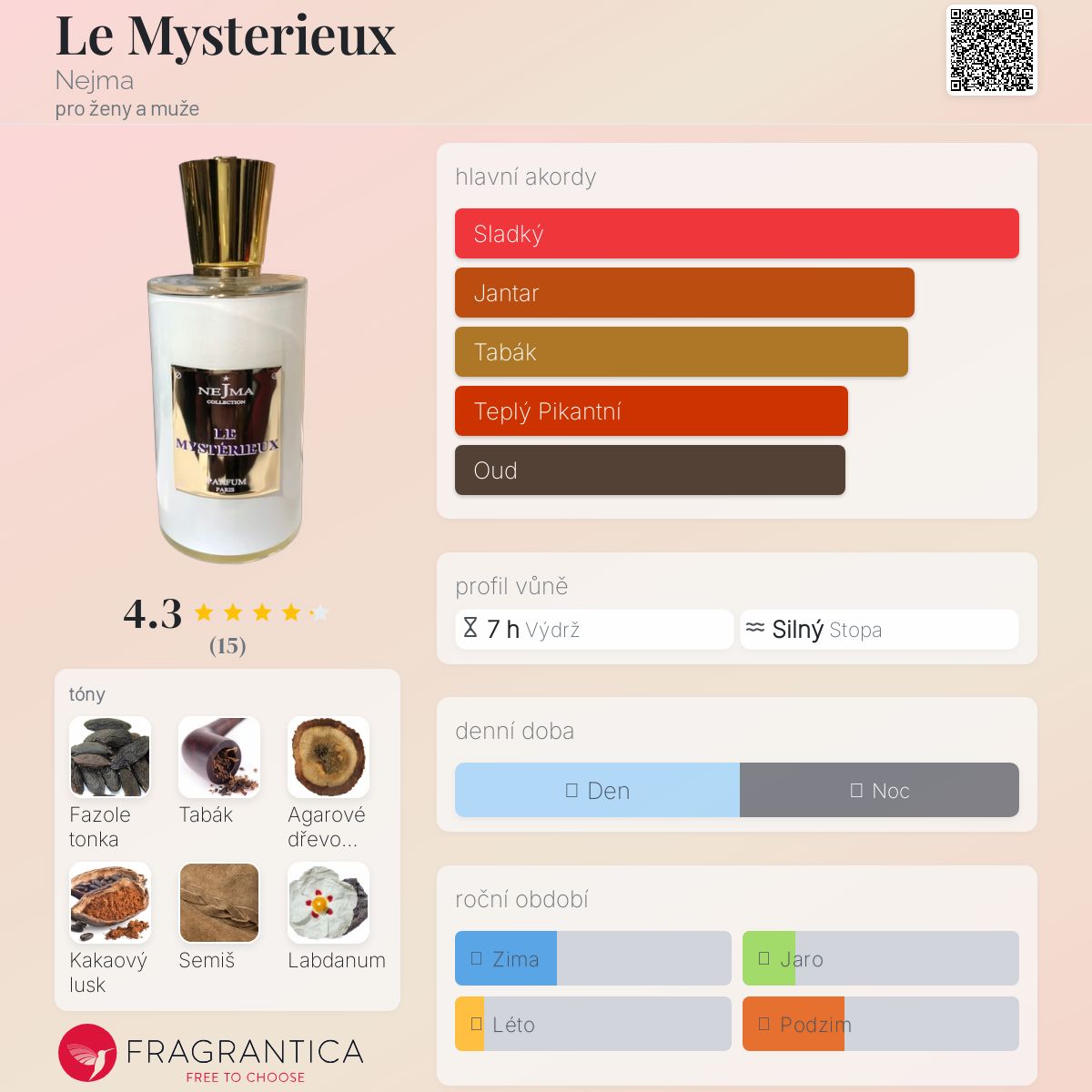 Le Mysterieux podle Nejma je vůně pro ženy a muže. Le Mysterieux byl/a uveden/a v roce 2018. Vrchní tóny jsou Labdanum, Badyán, Hruška, Mandarinka a Karamel; střední tóny jsouAgarové dřevo (oud), Kakaový lusk, Slaměnka a Damašská růže ; základní tóny jsou Fazole tonka, Tabákový list, Semiš a Vetiver.