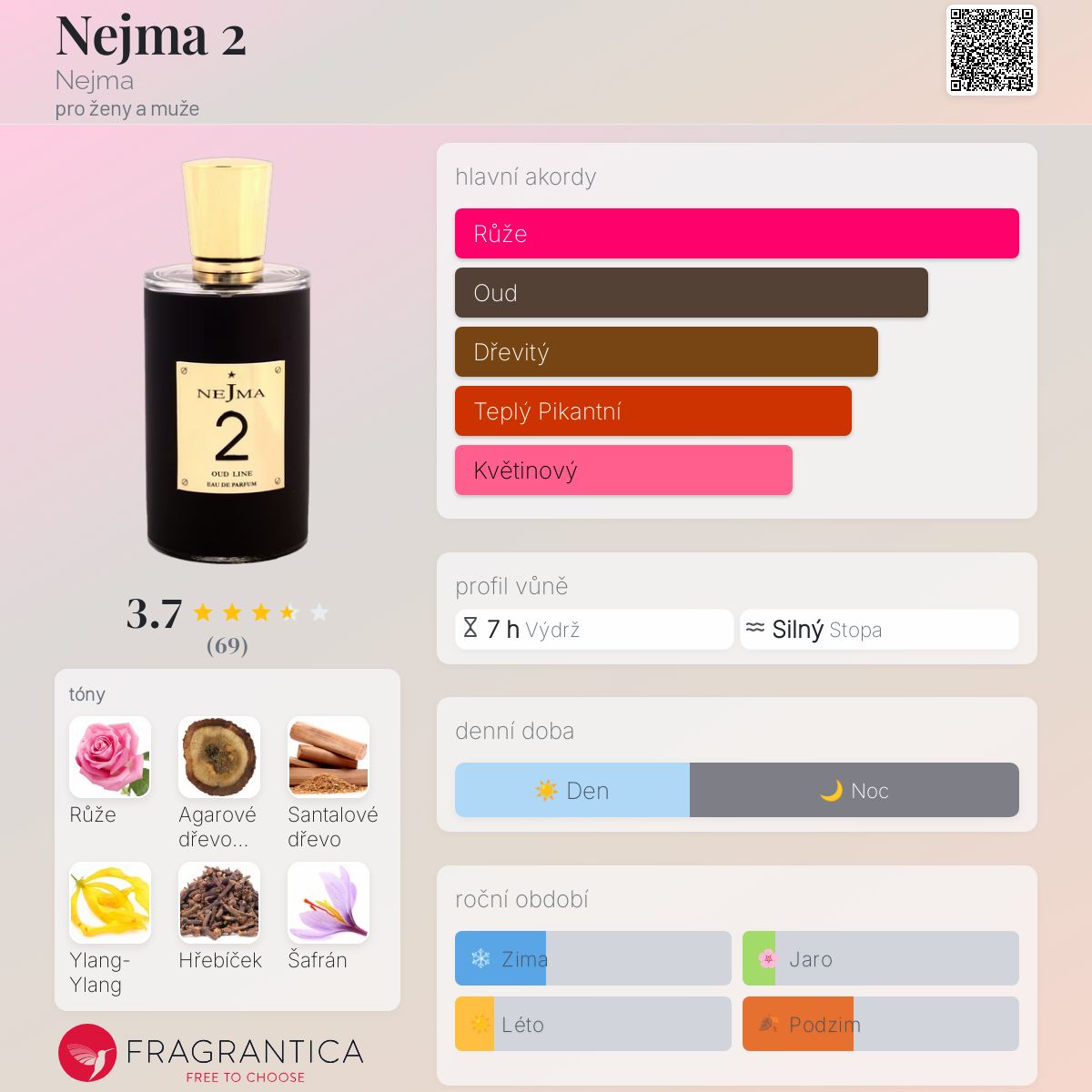 Nejma 2 podle Nejma je Orientální Floral vůně pro ženy a muže. Nejma 2 byl/a uveden/a v roce 2014. "Nosem" za touto vůní je Alice Lavenat. Vrchní tóny jsou Bílá růže, Ylang-Ylang, Hřebíček a Šafrán; střední tóny jsouTurecká růže a Růže de Mai ; základní tóny jsou Agarové dřevo (oud) a Santalové dřevo.