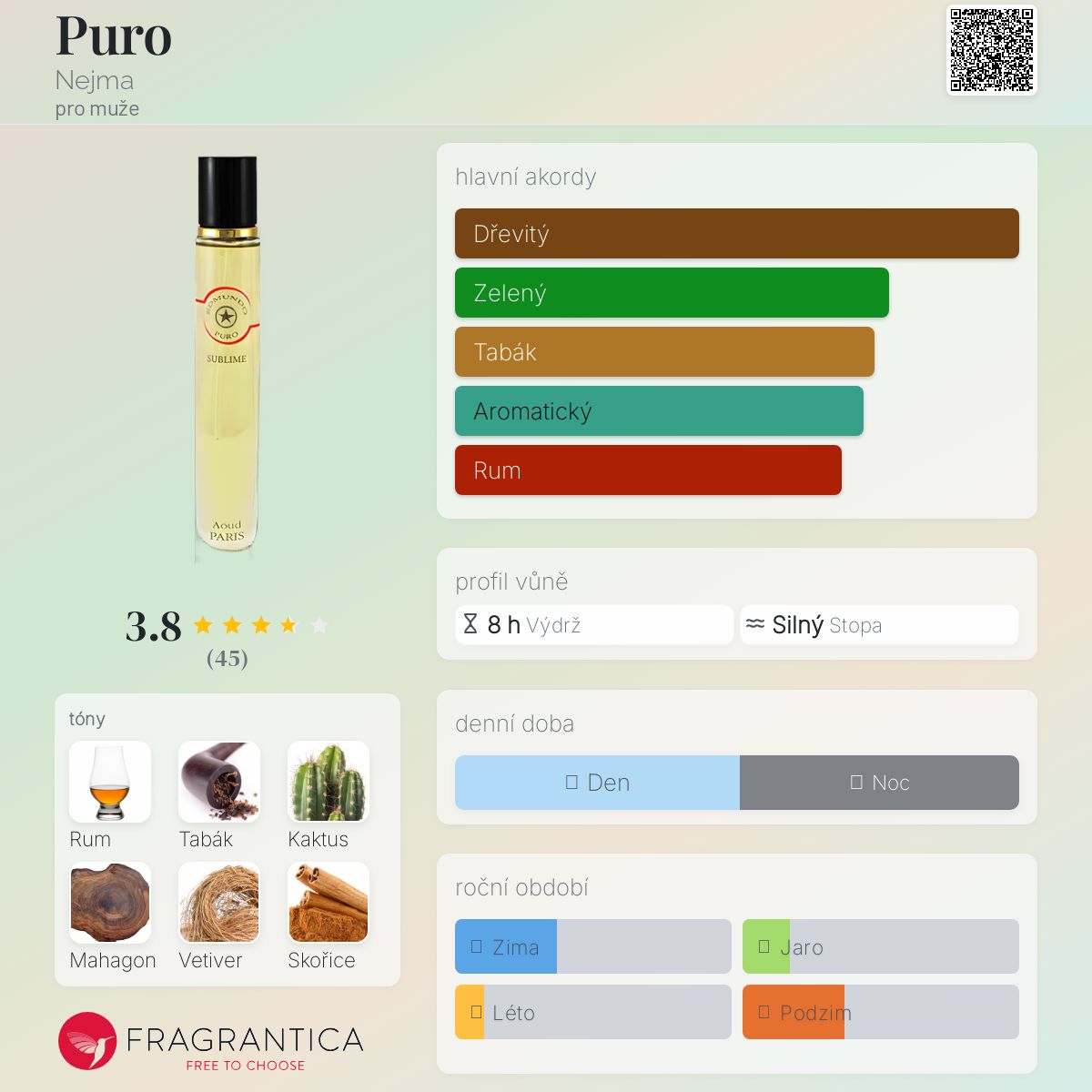 Puro podle Nejma je Aromatic Spicy vůně pro muže. Puro byl/a uveden/a v roce 2010. "Nosem" za touto vůní je Christian Bousidan. Vrchní tóny jsou Rum, Máta a Limetka; střední tóny jsouKaktus a Skořice ; základní tóny jsou Tabák, Mahagon a Vetiver.