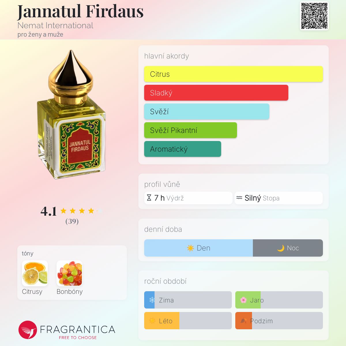 Jannatul Firdaus podle Nemat International je Citrus vůně pro ženy a muže. Jannatul Firdaus byl/a uveden/a v roce 1991.