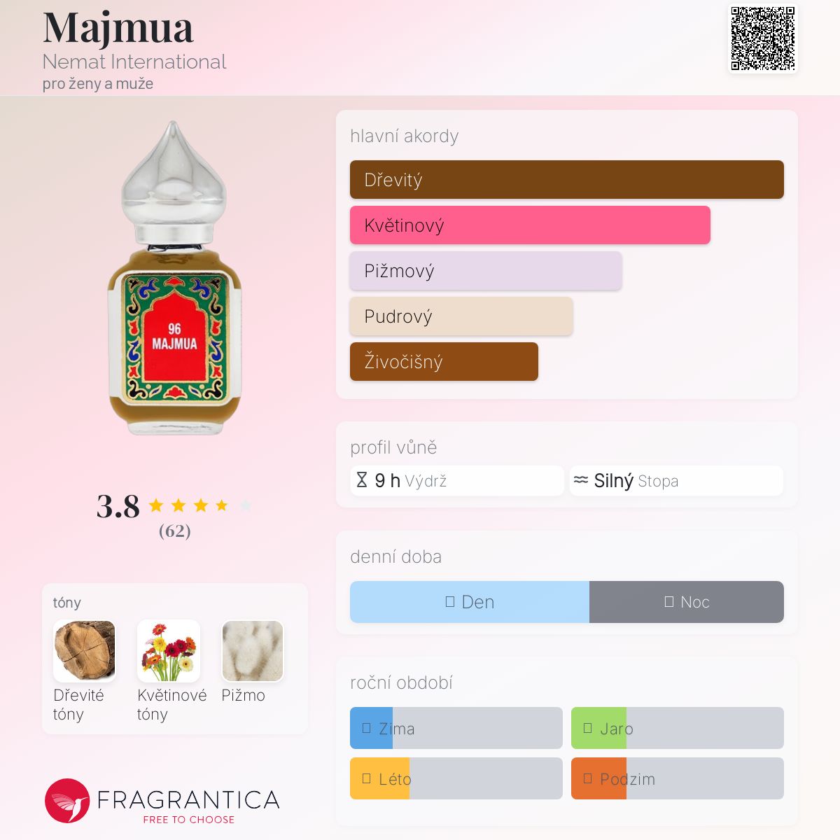 Majmua podle Nemat International je Floral Woody Musk vůně pro ženy a muže. Majmua byl/a uveden/a v roce 1991.
