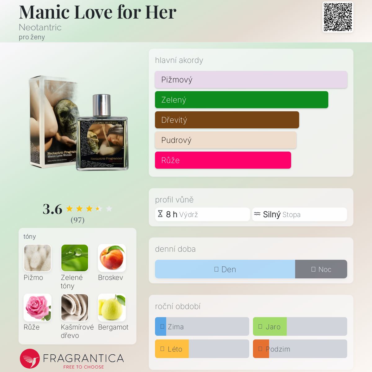 Manic Love for Her podle Neotantric je Floral Woody Musk vůně pro ženy. Manic Love for Her byl/a uveden/a v roce 2009. Vrchní tóny jsou Zelené tóny, Bergamot a Anýz; střední tóny jsouRůže, Kašmírové dřevo, Mořské tóny a Konvalinka ; základní tóny jsou Bílé pižmo, Broskev a Cedr.