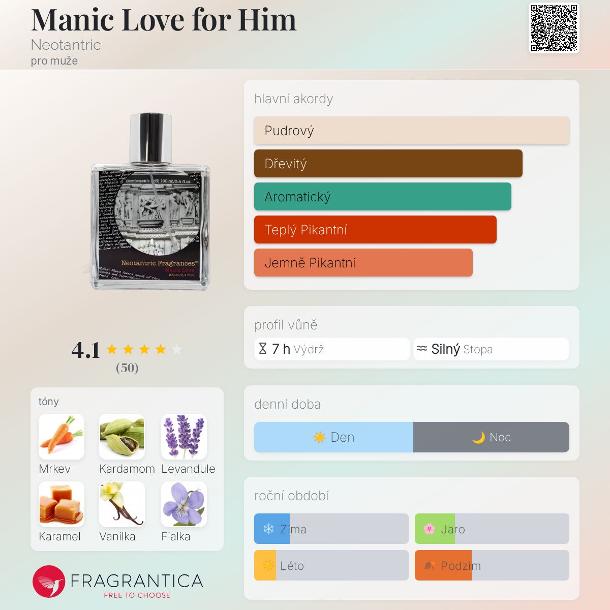 Manic Love for Him podle Neotantric je vůně pro muže. Manic Love for Him byl/a uveden/a v roce 2009. Vrchní tóny jsou Kardamom, Levandule, Bergamot, Zelené listí a Citrón; střední tóny jsouMrkev, Karamel, Cedr, Cypřiš a Frézie ; základní tóny jsou Vanilka, Fialka, Pačuli, Pižmo a Mech.