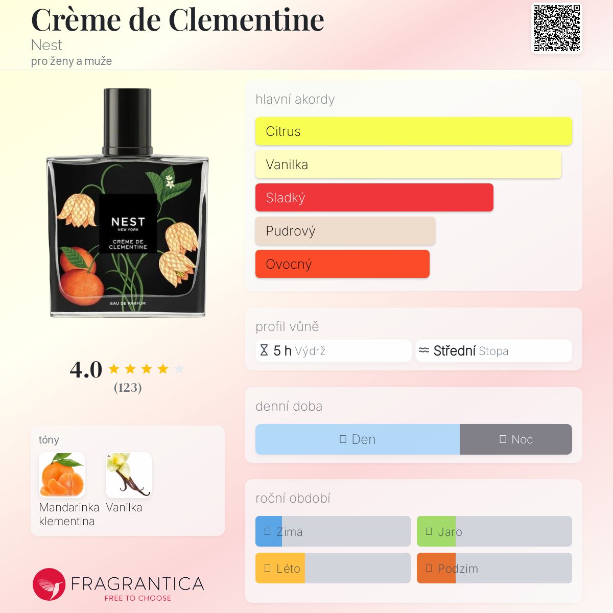 Crème de Clementine podle Nest je Citrus Gourmand vůně pro ženy a muže. Toto je nová vůně. Crème de Clementine byl/a uveden/a v roce 2025. Vrchní tón je Mandarinka klementina ; střední tón jeVanilka ;