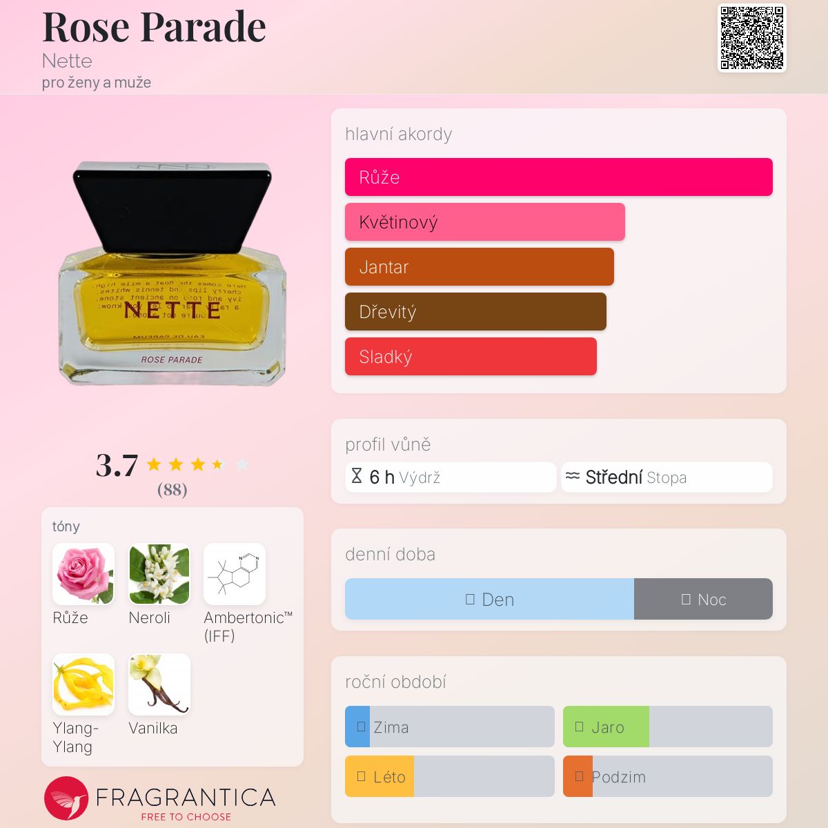Rose Parade podle Nette je Floral vůně pro ženy a muže. Rose Parade byl/a uveden/a v roce 2023. Vrchní tóny jsou Růže, Růžový olej a Neroli; střední tón jeYlang-Ylang ; základní tóny jsou Ambertonic a Vanilkový lusk.