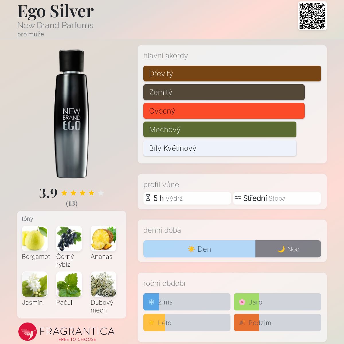 Ego Silver podle New Brand Parfums je Orientální Woody vůně pro muže. Ego Silver byl/a uveden/a v roce 2017. Vrchní tóny jsou Bergamot, Černý rybíz a Ananas; střední tóny jsouJasmín, Pačuli a Červené ovoce ; základní tóny jsou Dubový mech, Jantar (ambra) a Pižmo.