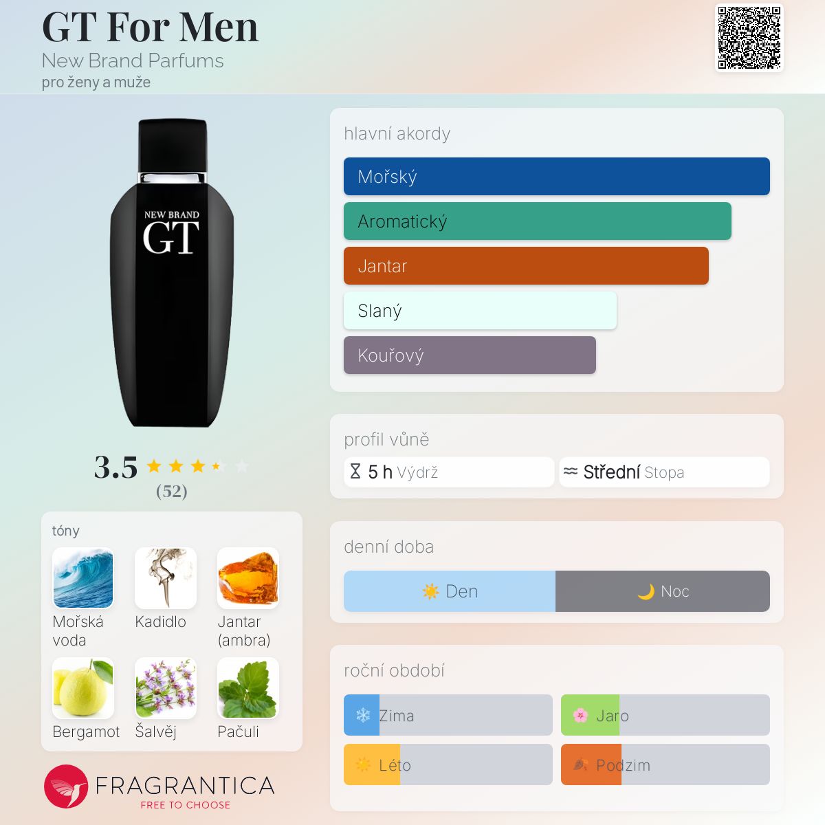GT For Men podle New Brand Parfums je Aromatic Aquatic vůně pro ženy a muže. GT For Men byl/a uveden/a v roce 2018. Vrchní tóny jsou Mořské tóny a Bergamot; střední tóny jsouŠalvěj a Pelargónie ; základní tóny jsou Kadidlo, Jantar (ambra) a Pačuli.