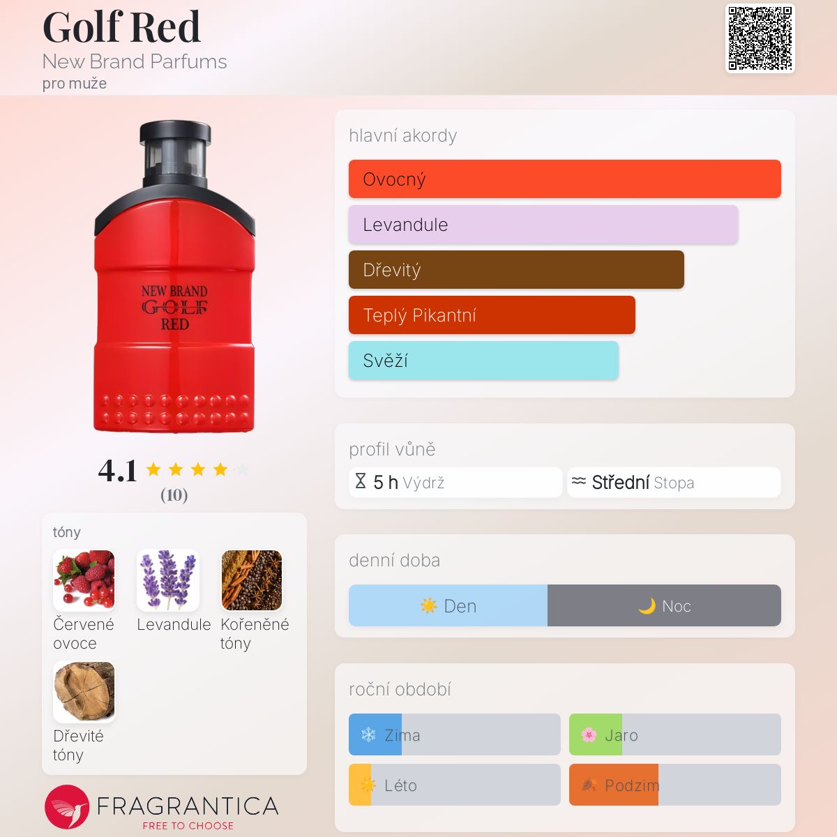 Golf Red podle New Brand Parfums je Woody Aromatic vůně pro muže. Golf Red byl/a uveden/a v roce 2020. Vrchní tón je Červené ovoce ; střední tóny jsouLevandule a Koření ; základní tón je Dřevité tóny.