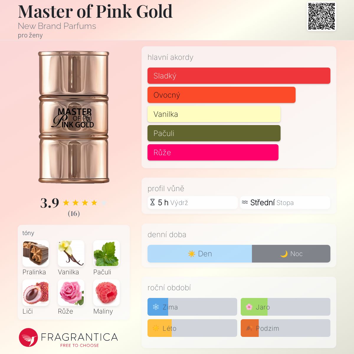 Master of Pink Gold podle New Brand Parfums je Floral vůně pro ženy. Master of Pink Gold byl/a uveden/a v roce 2017. Vrchní tóny jsou Liči a Maliny; střední tóny jsouDamašská růže a Kadidlo ; základní tóny jsou Vanilka, Pačuli a Pralinka.