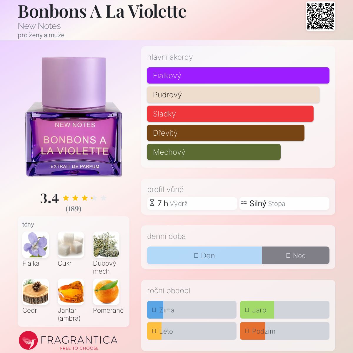 Bonbons A La Violette podle New Notes je Orientální Floral vůně pro ženy a muže. Toto je nová vůně. Bonbons A La Violette byl/a uveden/a v roce 2024. Vrchní tóny jsou Pomeranč a Bergamot; střední tóny jsouFialka, Cukr a Jasmín ; základní tóny jsou Mech, Cedr, Jantar (ambra) a Vanilka.