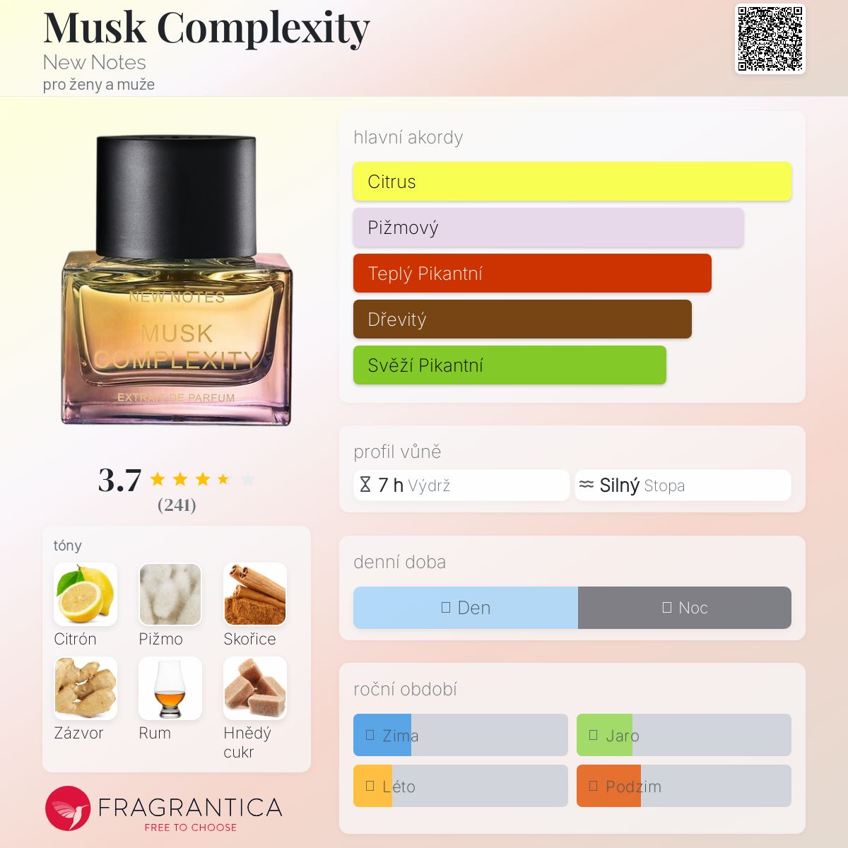 Musk Complexity podle New Notes je Woody Floral Musk vůně pro ženy a muže. Musk Complexity byl/a uveden/a v roce 2022. Vrchní tóny jsou Citrón, Zázvor, Rum, Bergamot, Petitgrain a Červené ovoce; střední tóny jsouKvět čokolády, Labdanum, Kardamom a Jasmín ; základní tóny jsou Pižmo, Skořice, Hnědý cukr, Zvířecí tóny, Syntetická cibetka, Pačuli, Guajakové dřevo a Santalové dřevo.