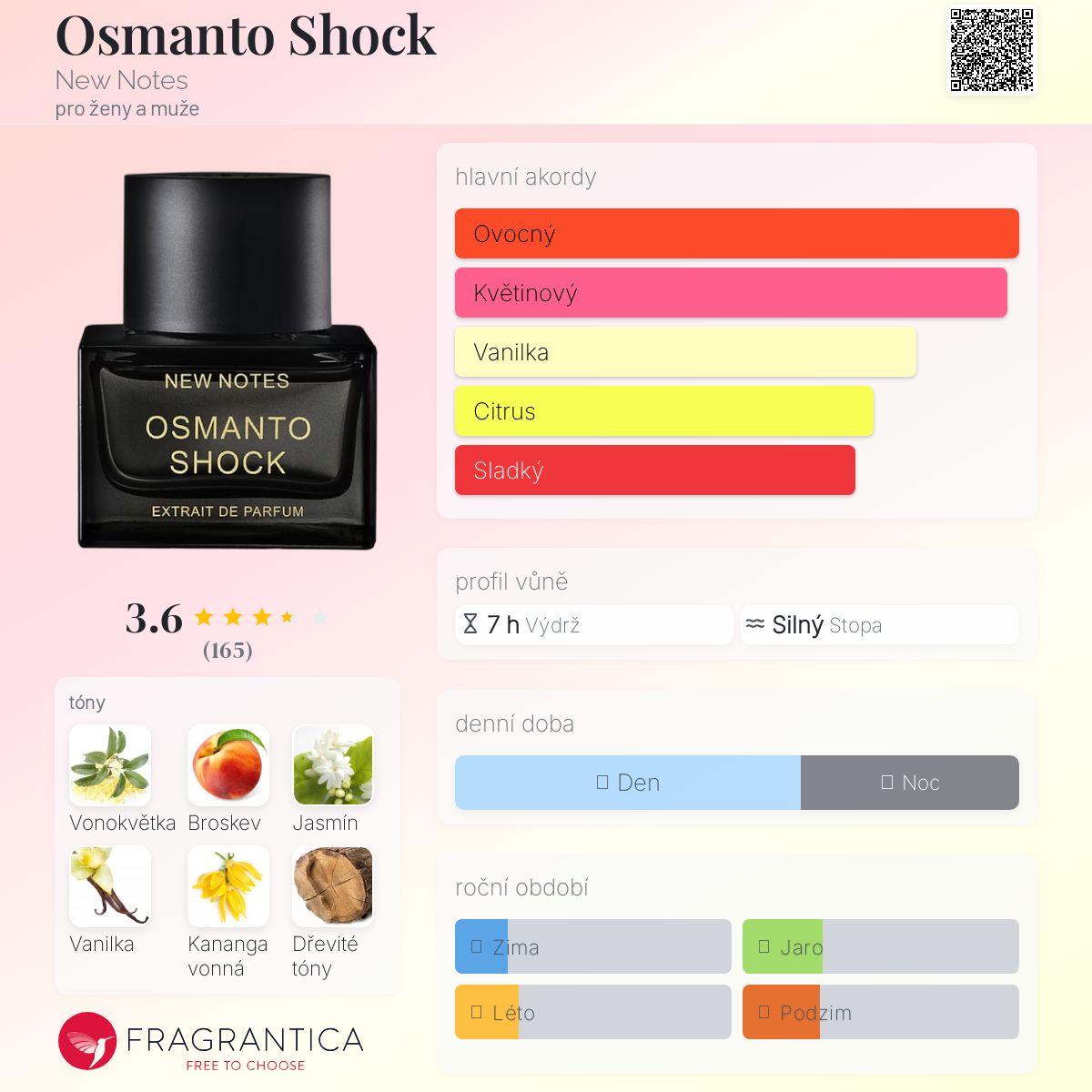 Osmanto Shock podle New Notes je Floral Woody Musk vůně pro ženy a muže. Osmanto Shock byl/a uveden/a v roce 2022. Vrchní tóny jsou Bílá broskev, Bergamot, Žlutá mandarinka, Sladký pomeranč a Růžový pepř; střední tóny jsouVonokvětka, Jasmín, Kananga vonná, Bílá růže a Kardamom ; základní tóny jsou Vanilka, Orientální dřevité tóny, Fazole tonka, Ambrette (přírodní pižmo) a Pačuli.