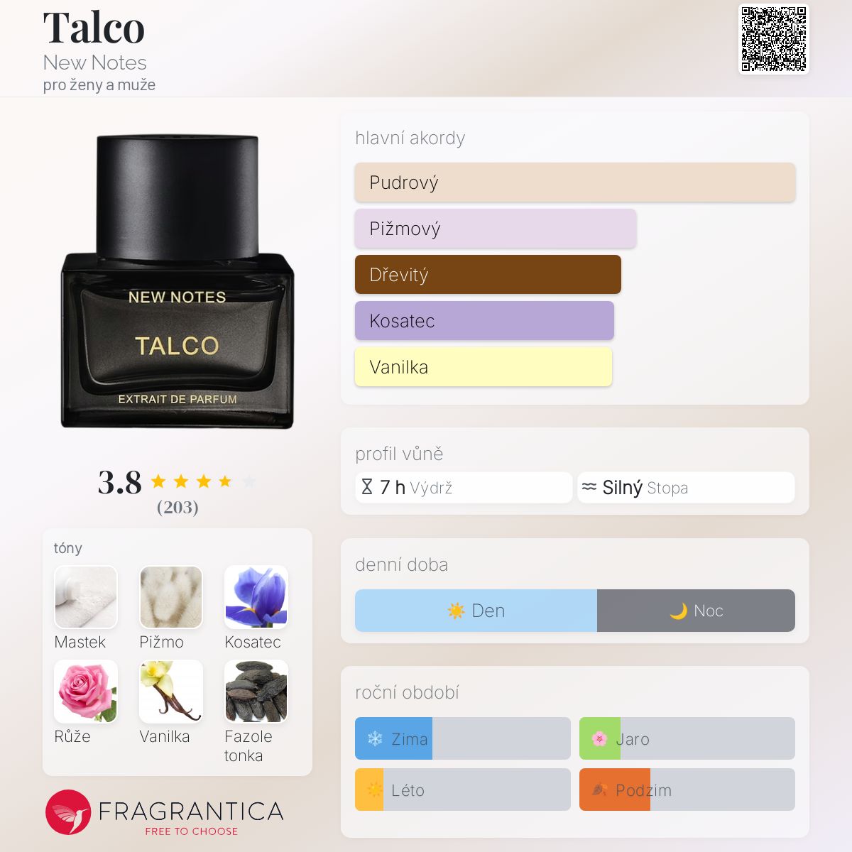 Talco podle New Notes je vůně pro ženy a muže. Toto je nová vůně. Talco byl/a uveden/a v roce 2022. Vrchní tóny jsou Mastek, Damašská růže, Bergamot a Jasmín; střední tóny jsouKosatec, Marocká růže, Ylang-Ylang a Palisandr ; základní tóny jsou Pižmo, Vanilka, Fazole tonka, Jantar (ambra) a Vzácné dřevo.