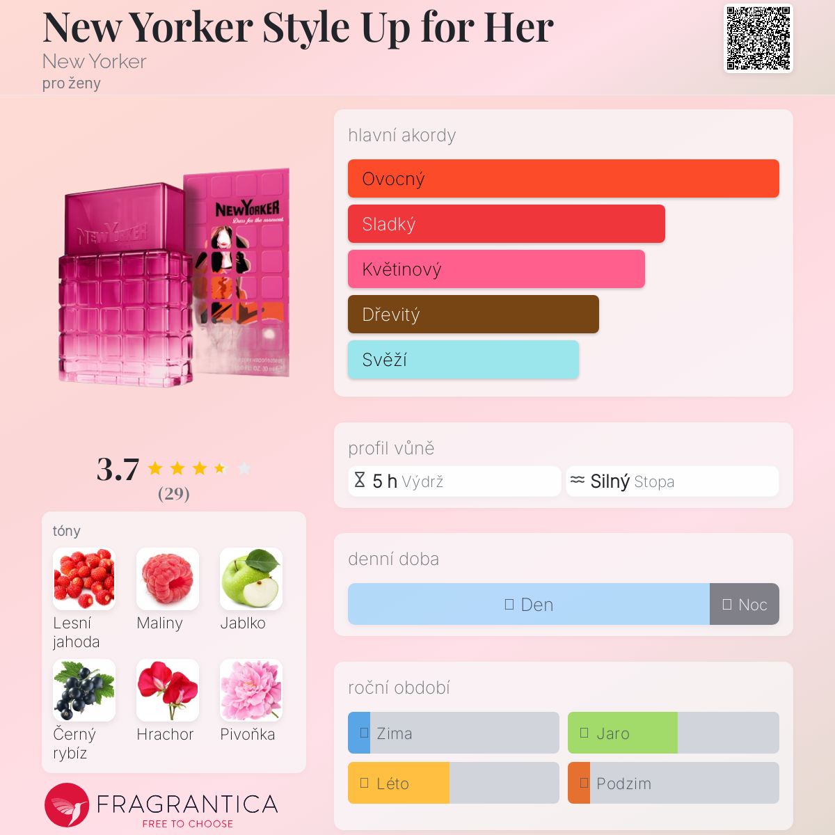 New Yorker Style Up for Her podle New Yorker je Floral Fruity vůně pro ženy. New Yorker Style Up for Her byl/a uveden/a v roce 2013. Vrchní tóny jsou Lesní jahoda, Zelené jablko a Černý rybíz; střední tóny jsouHrachor, Pivoňka a Frézie ; základní tóny jsou Maliny, Santalové dřevo a Bílé pižmo.