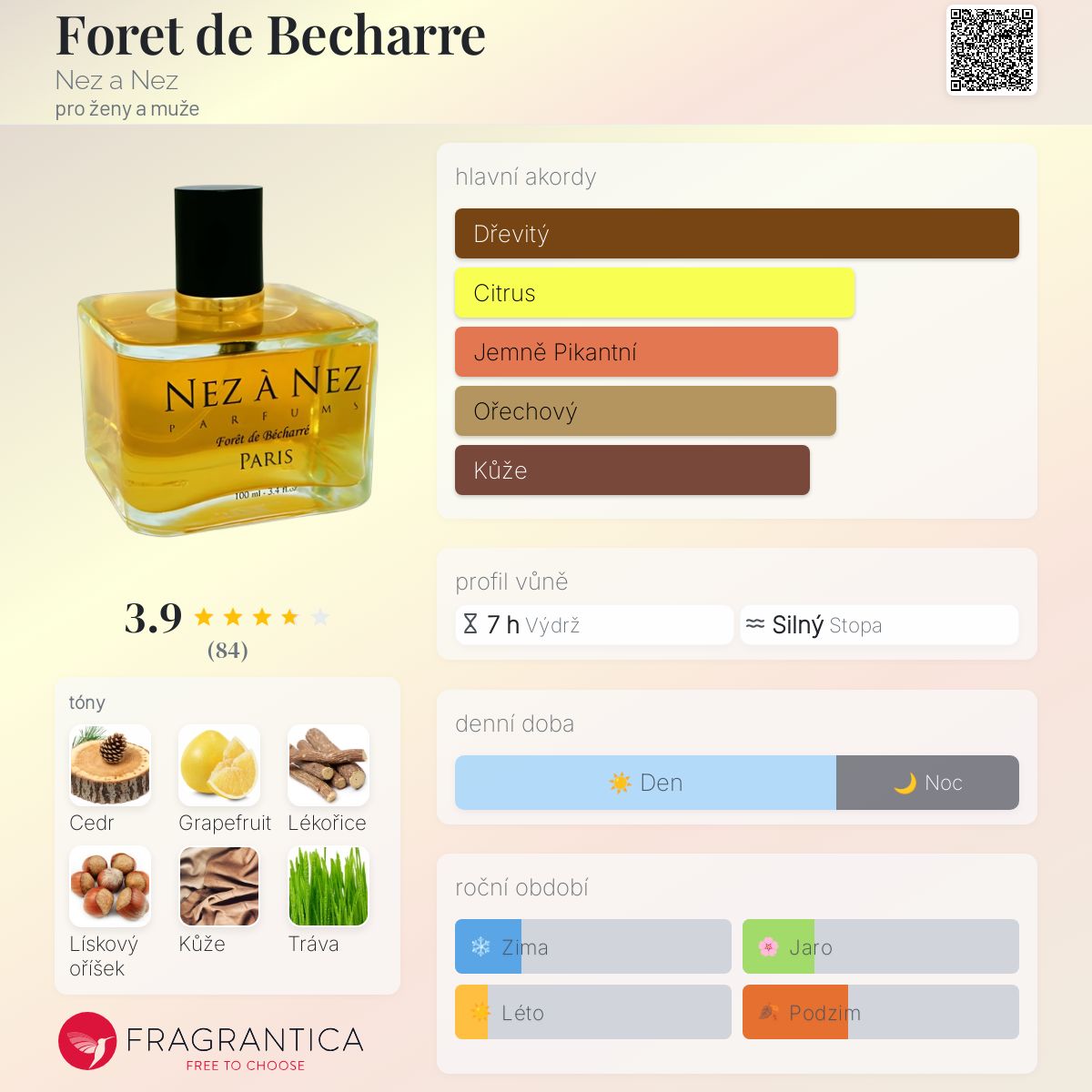 Foret de Becharre podle Nez a Nez je Woody Spicy vůně pro ženy a muže. "Nosem" za touto vůní je Karine Chevallier. Vrchní tóny jsou Grapefruit a Lékořice; střední tóny jsouVirginský cedr, Lískový oříšek, Tráva a Skořice ; základní tóny jsou Kůže, Jantar (ambra) a Vanilka.