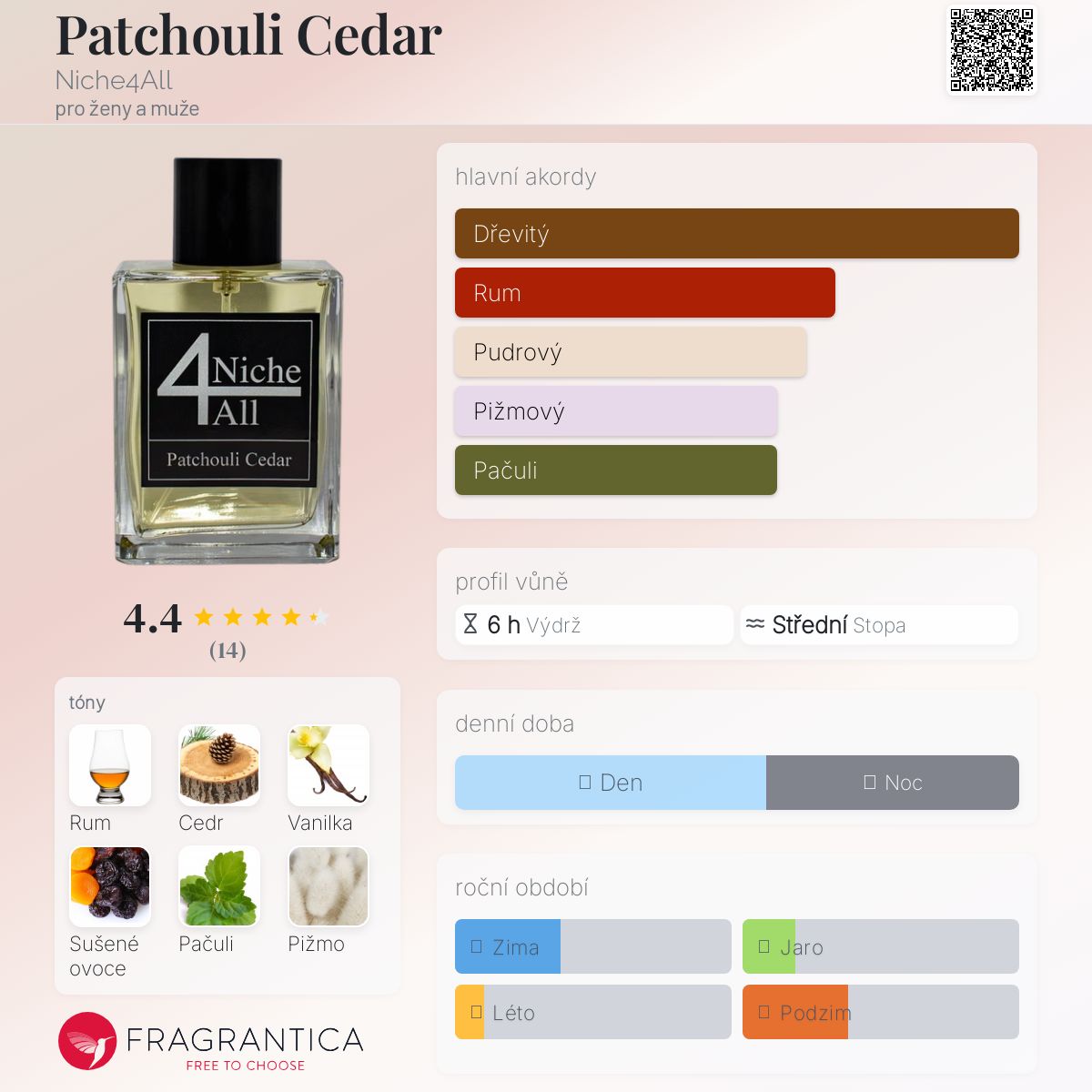Patchouli Cedar podle Niche4All je Orientální Woody vůně pro ženy a muže. Patchouli Cedar byl/a uveden/a v roce 2020. Vrchní tón je Rum ; střední tóny jsouVanilka a Sušené ovoce ; základní tóny jsou Cedr, Pačuli a Pižmo.