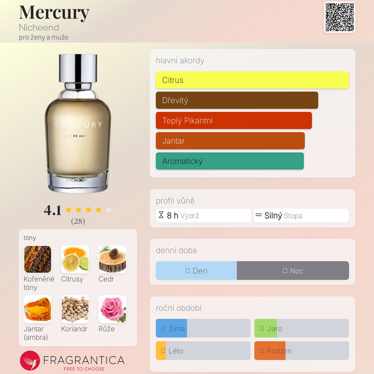 Mercury podle Nicheend je vůně pro ženy a muže. Mercury byl/a uveden/a v roce 2022. Vrchní tóny jsou Citrusy, Koriandr a Bergamot; střední tón jeTurecká růže ; základní tóny jsou Koření, Cedr a Jantar (ambra).