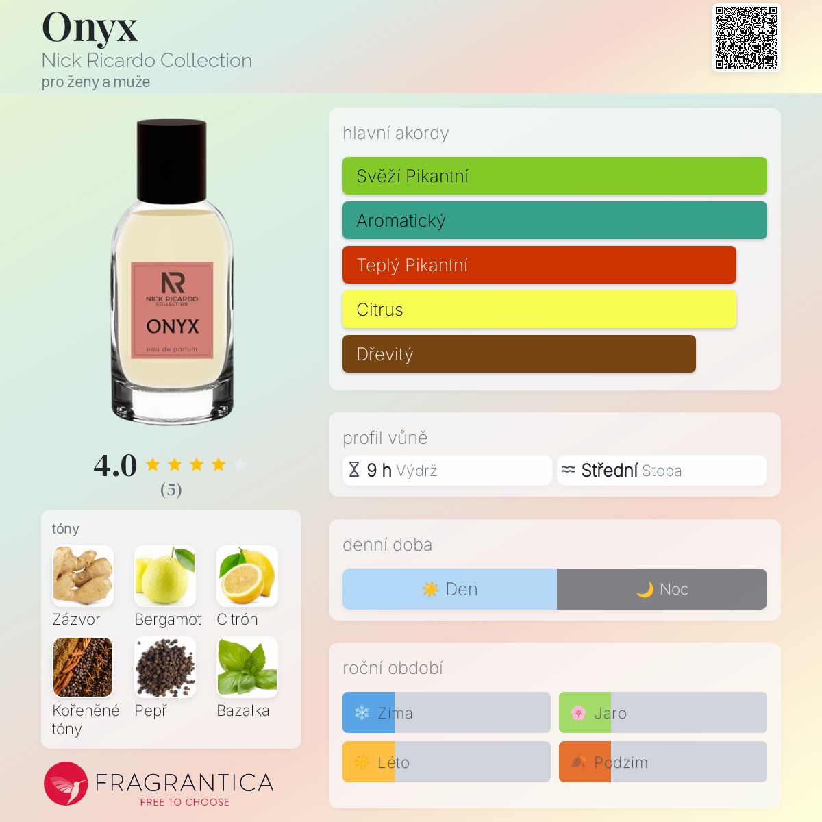 Onyx podle Nick Ricardo Collection je Woody vůně pro ženy a muže. Onyx byl/a uveden/a v roce 2019. "Nosem" za touto vůní je Roger Howell. Vrchní tóny jsou Zázvor, Bergamot a Citrón; střední tóny jsouKořeněné tóny, Bílý pepř, Bazalka a Fialkový list ; základní tóny jsou Fazole tonka, Tahitský vetiver a Cedr.