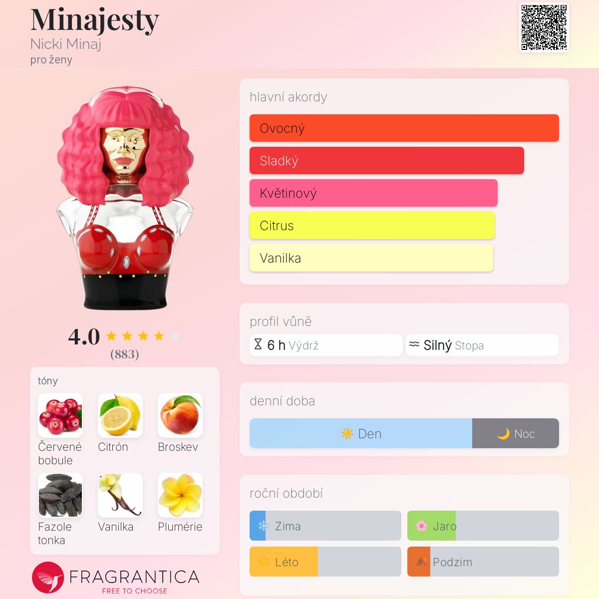 Minajesty podle Nicki Minaj je Floral Fruity vůně pro ženy. Minajesty byl/a uveden/a v roce 2013. Vrchní tóny jsou Červené bobule, Citrón a Broskev; střední tóny jsouPlumérie, Orchidej a Magnólie ; základní tóny jsou Fazole tonka, Vanilka a Pižmo.