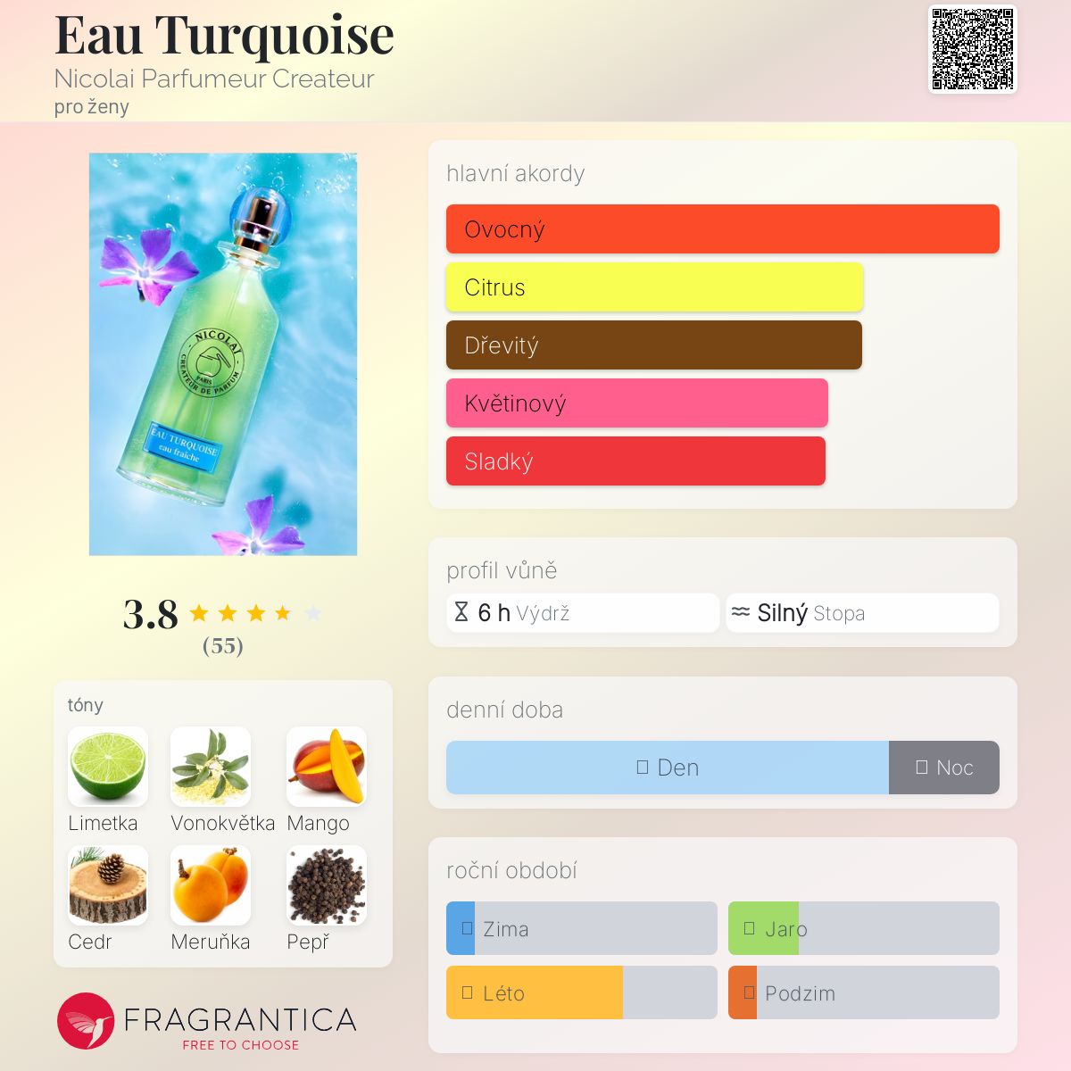 Eau Turquoise podle Nicolai Parfumeur Createur je Floral Fruity vůně pro ženy. Eau Turquoise byl/a uveden/a v roce 2008. "Nosem" za touto vůní je Patricia de Nicolai. Vrchní tóny jsou Limetka, Mango a Meruňka; střední tóny jsouMadagaskarský pepř, Kardamom a Turecká růže ; základní tóny jsou Vonokvětka, Texaský cedr a Pačuli.