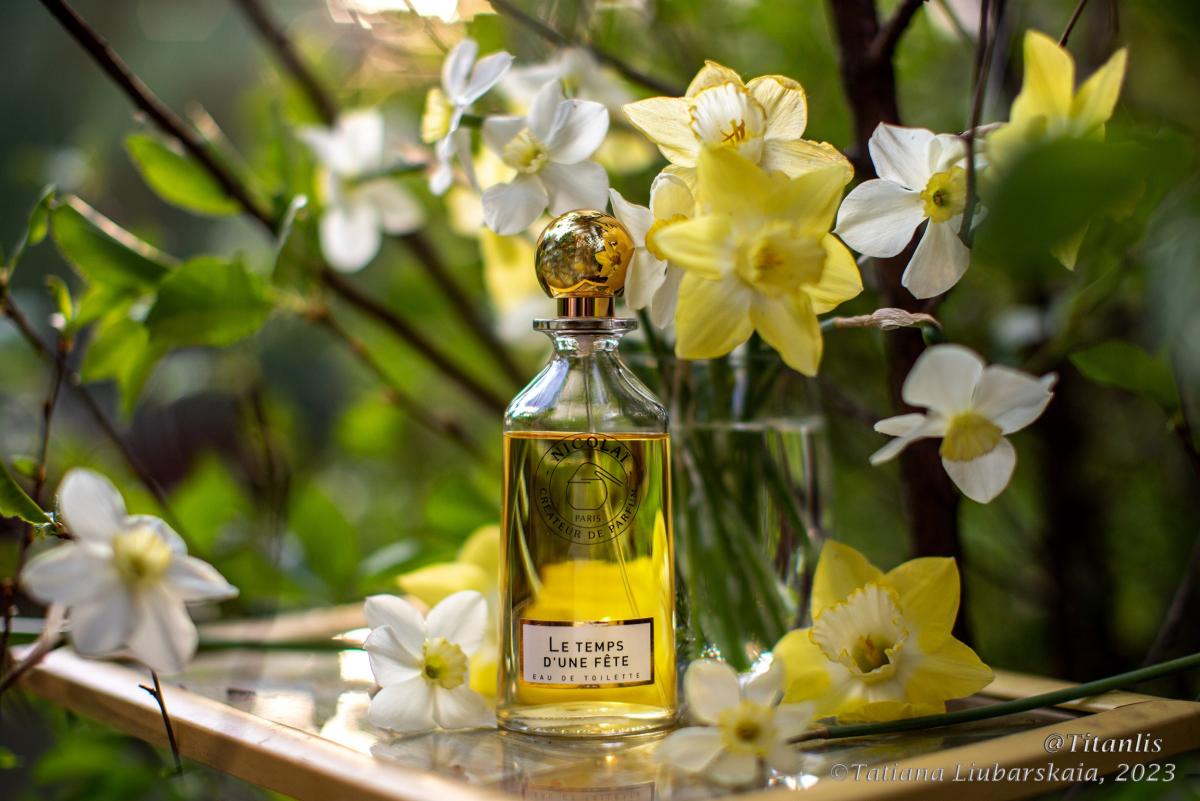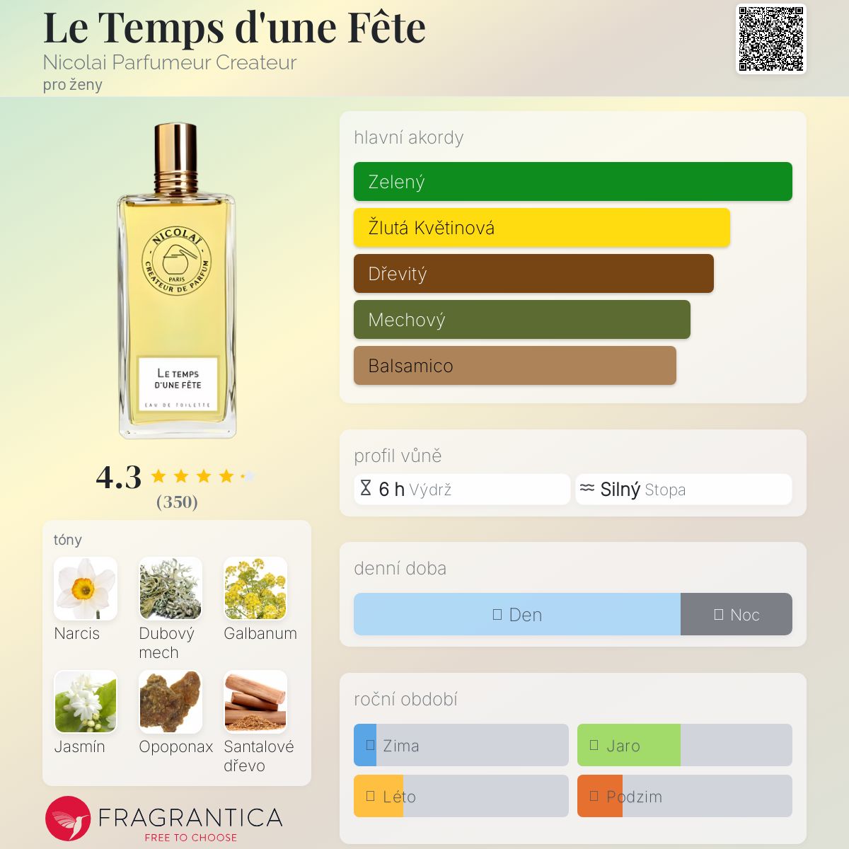 Le Temps d'une Fête podle Nicolai Parfumeur Createur je Floral Green vůně pro ženy. Le Temps d'une Fête byl/a uveden/a v roce 2007. "Nosem" za touto vůní je Patricia de Nicolai. Vrchní tóny jsou Galbanum a Opoponax; střední tóny jsouNarcis a Jasmín ; základní tóny jsou Dubový mech, Santalové dřevo, Dřevité tóny a Pačuli.