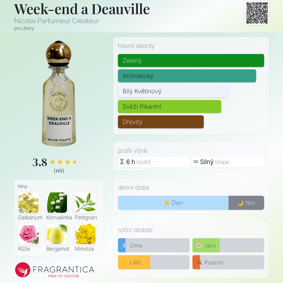 Week-end a Deauville podle Nicolai Parfumeur Createur je Chypre Floral vůně pro ženy. Week-end a Deauville byl/a uveden/a v roce 2009. "Nosem" za touto vůní je Patricia de Nicolai. Vrchní tóny jsou Galbanum, Paraguajský petitgrain a Bergamot; střední tóny jsouKonvalinka, Růže, Mimóza a Růžový pepř ; základní tóny jsou Styrax, Dubový mech a Hřebíček.
