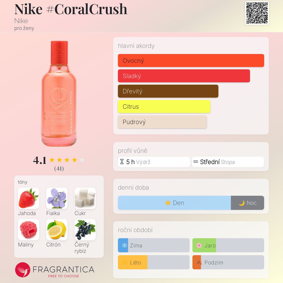 Nike #CoralCrush podle Nike je Floral Fruity vůně pro ženy. Nike #CoralCrush byl/a uveden/a v roce 2023. Vrchní tóny jsou Jahoda, Maliny, Citrón, Černý rybíz a Mandarinka; střední tóny jsouFialka, Jasmín, Kašmírové dřevo, Vanilka a Vzácné dřevo ; základní tóny jsou Cukr, Jantar (ambra), Pižmo, Pačuli a Dubový mech.