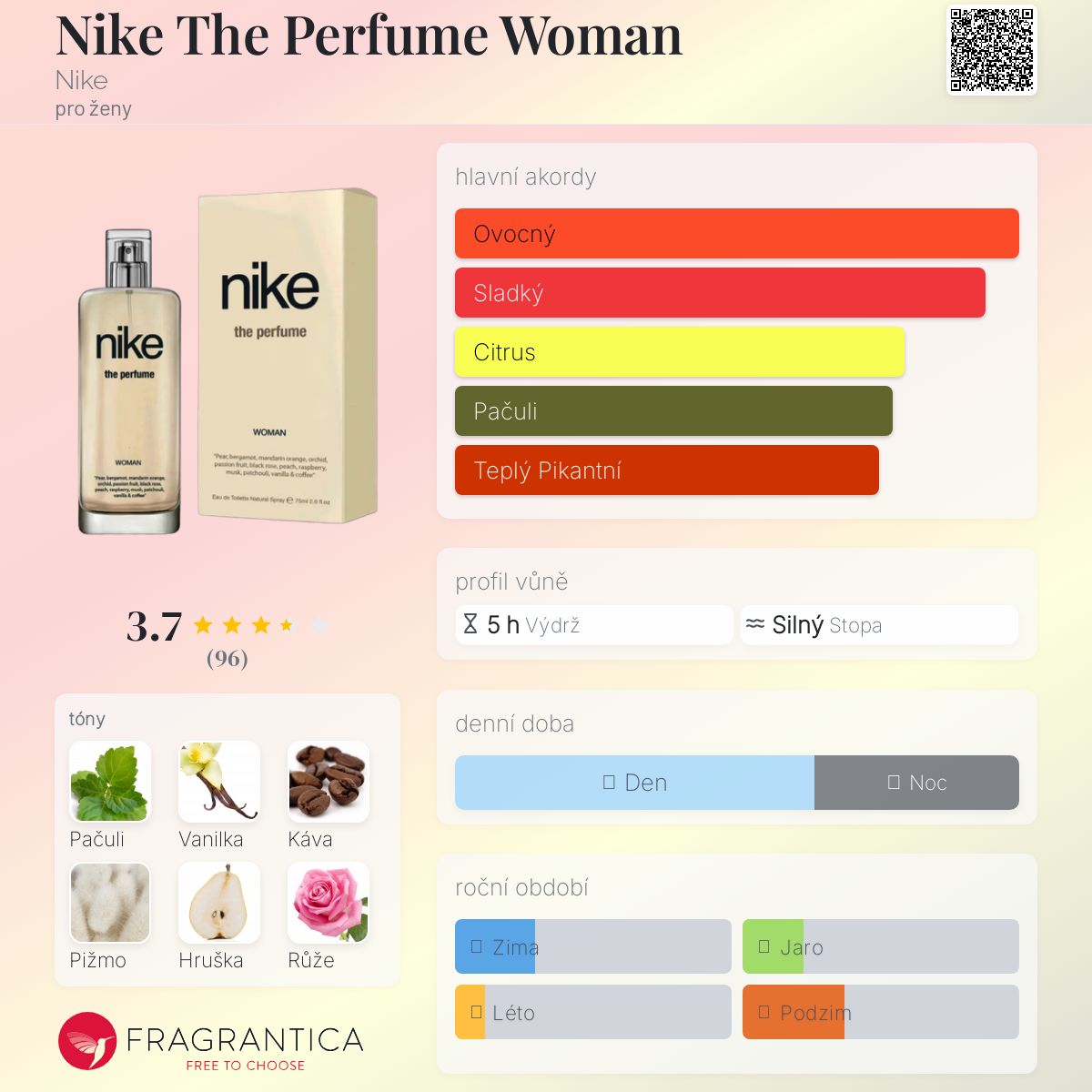 Nike The Perfume Woman podle Nike je Orientální Vanilla vůně pro ženy. Nike The Perfume Woman byl/a uveden/a v roce 2017. Vrchní tóny jsou Hruška, Mandarinka a Bergamot; střední tóny jsouPižmo, Černá růže, Broskev, Maliny, Orchidej a Mučenka ; základní tóny jsou Pačuli, Vanilka a Káva.