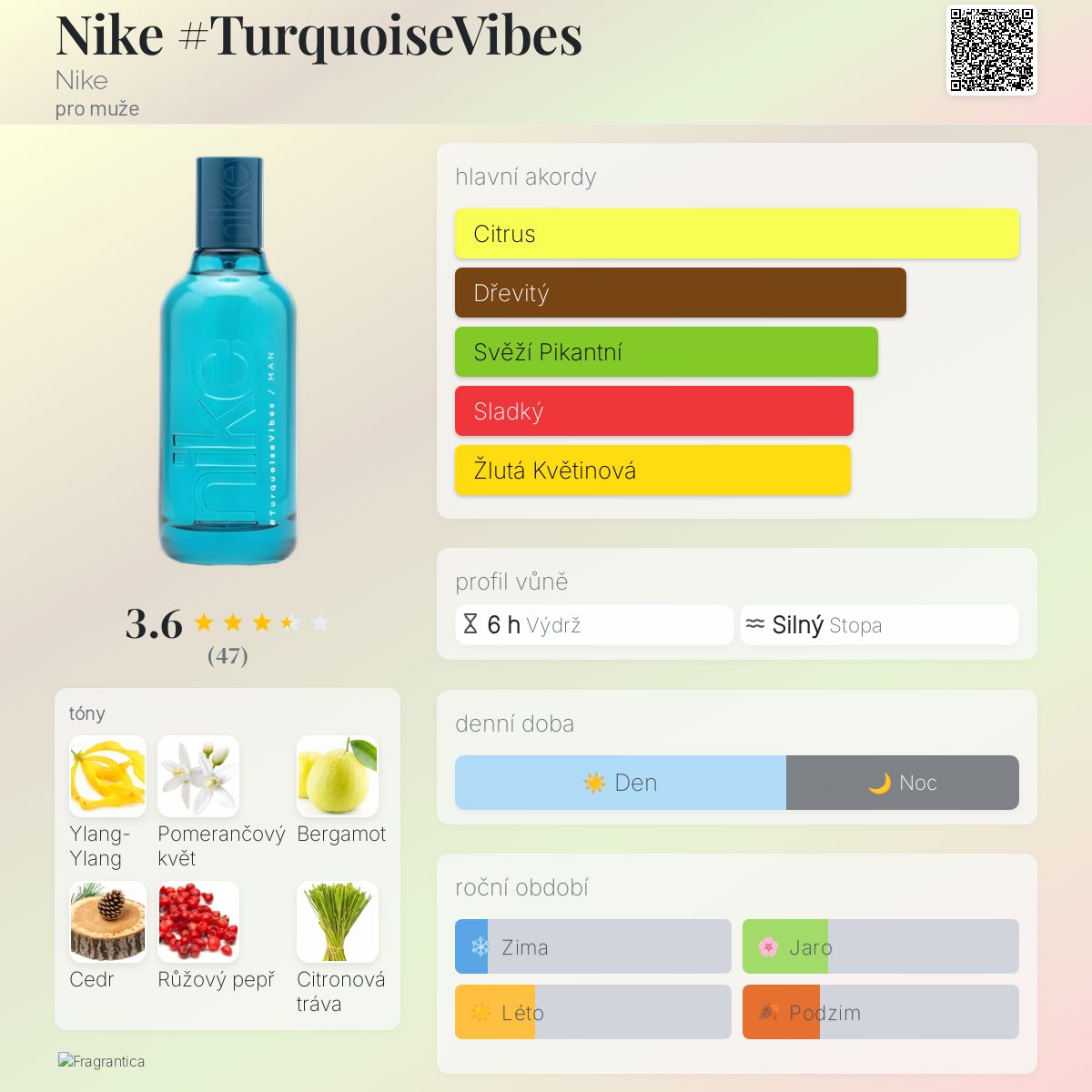 Nike #TurquoiseVibes podle Nike je Woody Aromatic vůně pro muže. Nike #TurquoiseVibes byl/a uveden/a v roce 2023. Vrchní tóny jsou Bergamot, Citronová tráva a Zázvor; střední tóny jsouYlang-Ylang, Pomerančový květ a Růžový pepř ; základní tóny jsou Cedr a Pižmo.